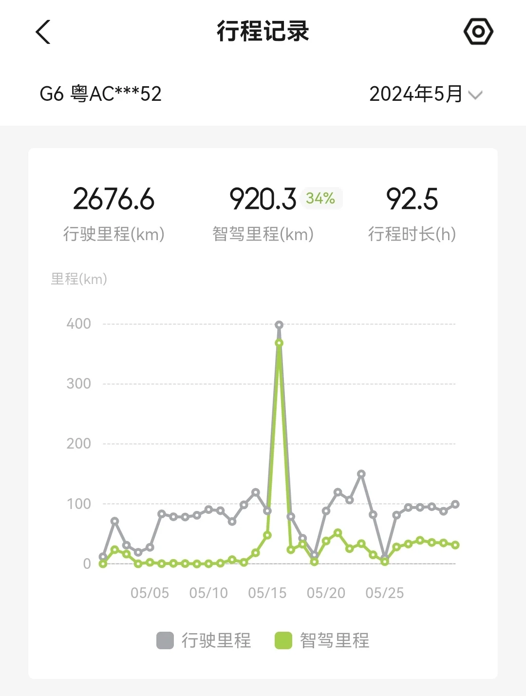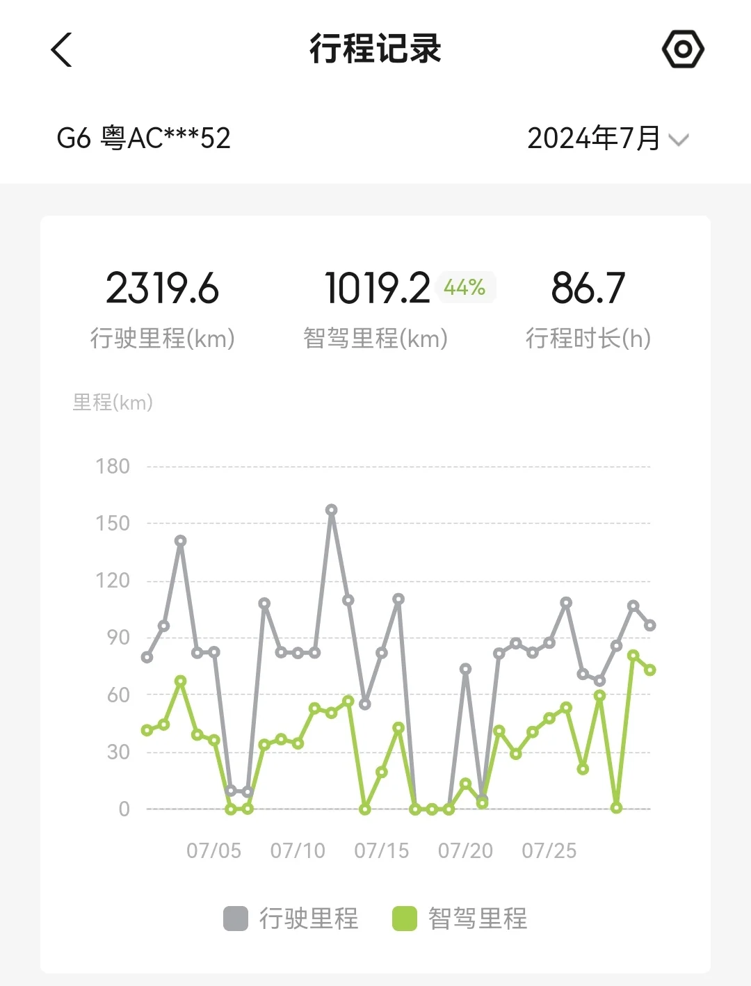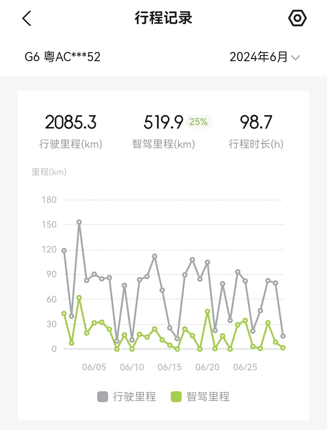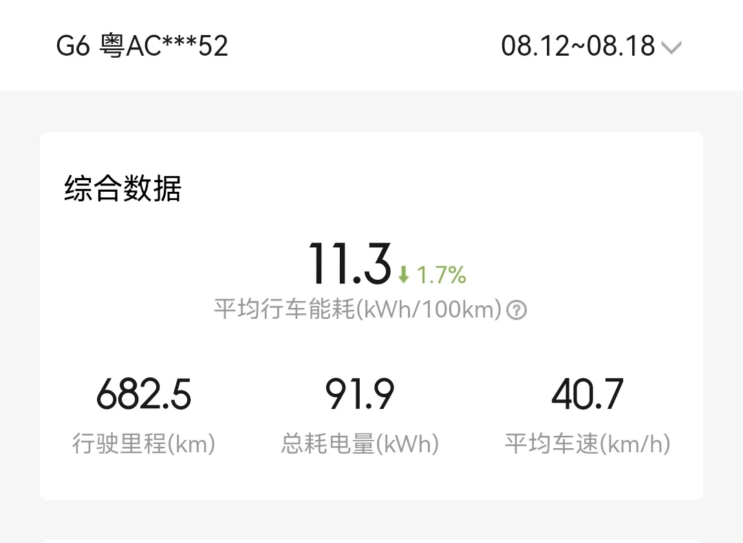 众所周知,使用 NGP的电耗会比人开要低很多,因此我十分喜欢使用NGP,节能又安全,随着aI代驾和无限XNGP上线,我的智驾比例每月都在上升。我的G6驾驶模式为舒适模式和中回收,舒适模式可以缓慢加速,很好地减少电耗,而中回收保证驾驶舒适的前提下,又能回收能量。我平时不走高速情况下,七天电耗都在11KWH/100KW左右,对于G6这么大的车,这个电耗水平,在业内处于领先水平。