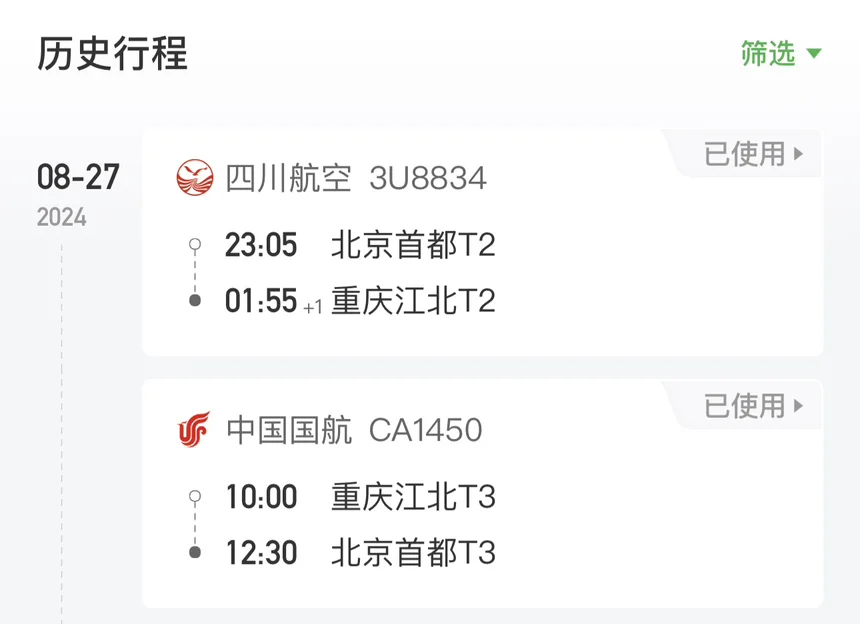 感谢老天的支持,两趟航班完美准点起降,在重庆42度的天气和北京29度的天气之间自由转换,一个来回,第一次把飞机坐出地铁的感觉。