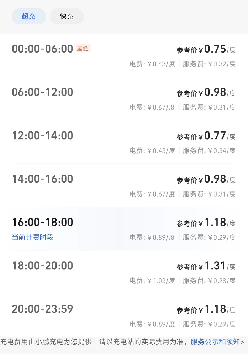 站内布置有4台720Kw超充和8台250Kw快充。充电站免费停车两小时。超充充电电价也超级良心便宜。真正做到了让鹏友们“少花时间少花钱”就能得到最好的充电体验。