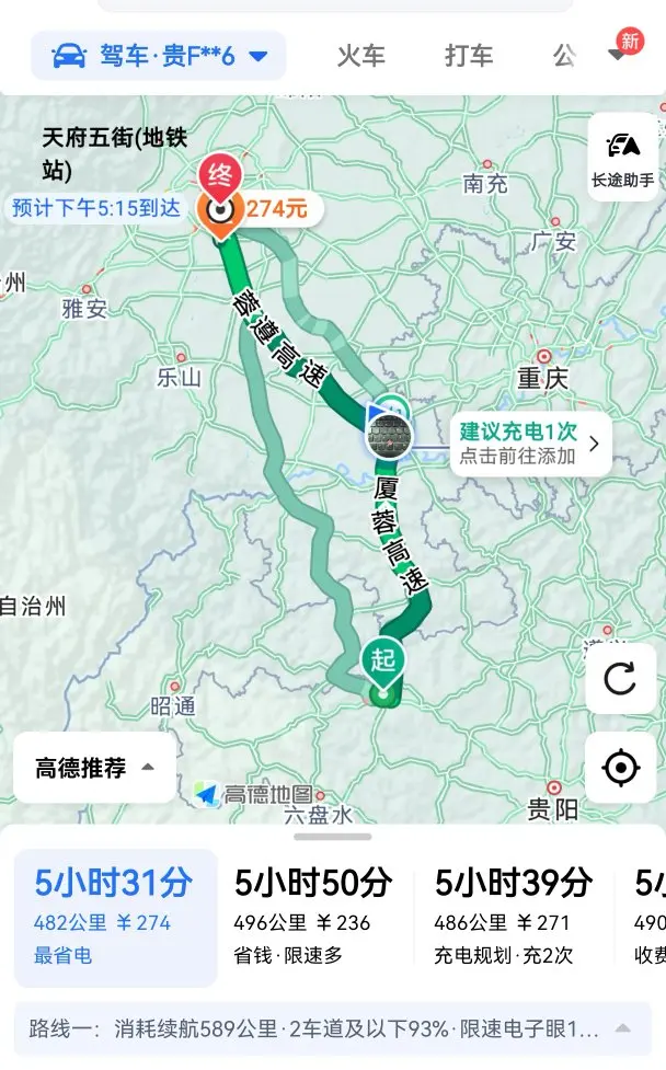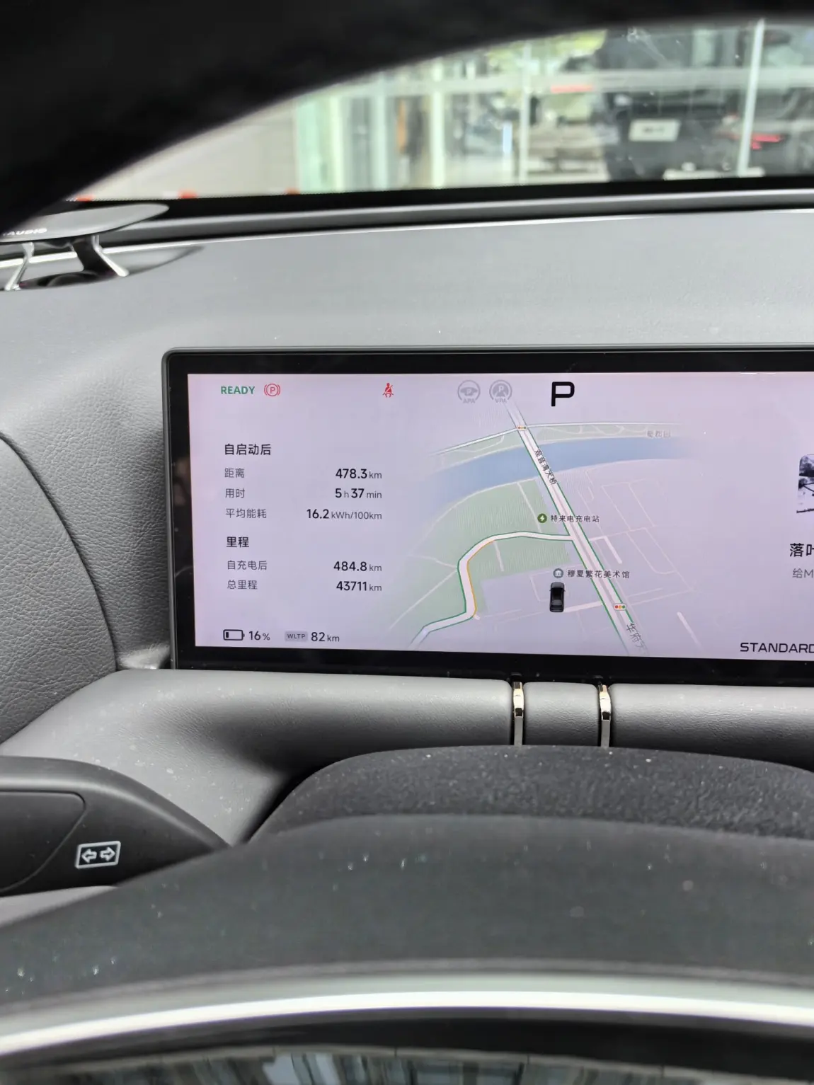 贵州毕节--成都,482公里。昨晚家冲100%满电,续航519。全程下坡,海拔1450到海拔560米。一人,空调21°,风量1档。到达成都天府五街,实际行驶484公里,剩余续航82公里!合计566公里!非常棒的能量回收!