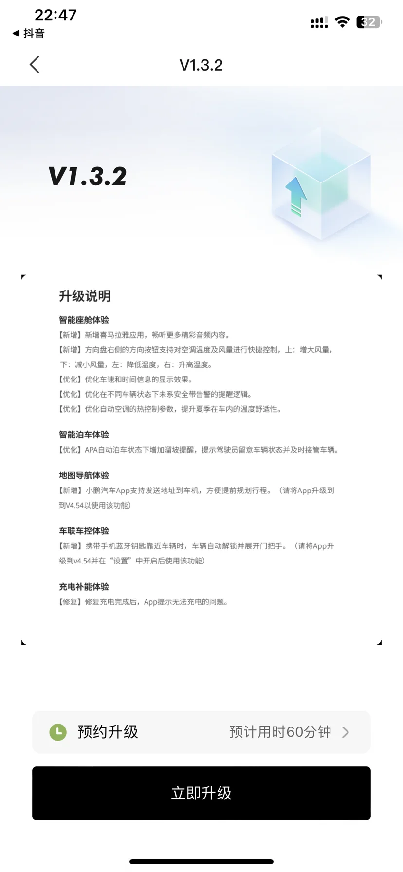 今天晚上收到了小鹏推送的OTA升级,可以升级到1.3.2版本,有不少的改动和升级。给大家看一下我的升级流程(ps:升级过程中无法使用车辆,建议夜间或者闲置时间升级哦) #小鹏MONA的首次OTA来了#