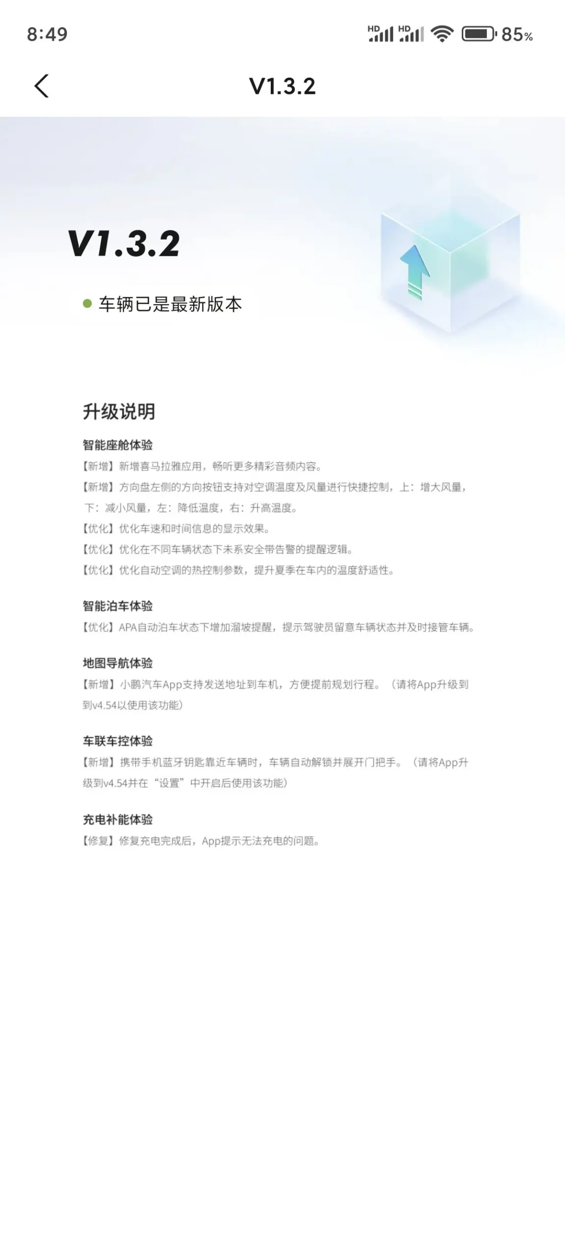 早上充完电回到单位停好车,就收到了消息可以ota了,而且是远程,马上点了,整个过程大概1小时。更新的功能挺不错,下班路上体会最多的就是空调的快捷方式了,可以直接操作按钮控制温度和风速,挺好用的。其他方面都挺好的,只是还没有机会深入尝试,个人觉得只要大家提的意见合理,官方一定很听话尽快为大家更新。比如之前说的哨兵模式,我相信在年底就能实现了。我个人比较喜欢bilibili,因为我买了会员,也看惯了!希望能尽快上线哦!小鹏!还有氛围灯能调亮一点吗?白天根本看不出,!😁#小鹏MONA的首次OTA来了#