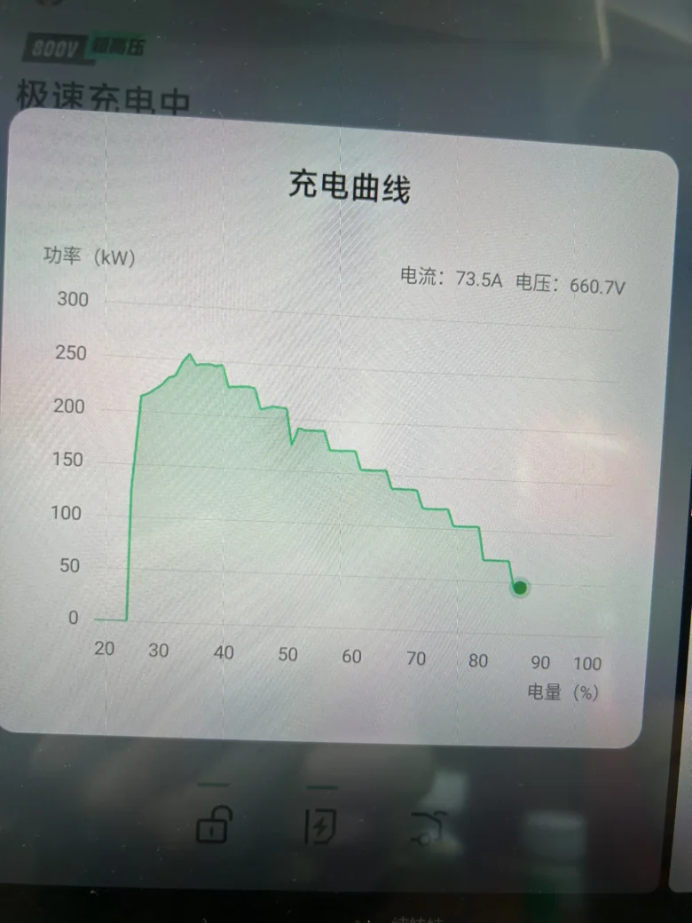 3.车机显示充电功率一上来就是260kw同样也是最高功率了,但是充电曲线一直在下降不知道怎么回事,平均功率在86.68kw。