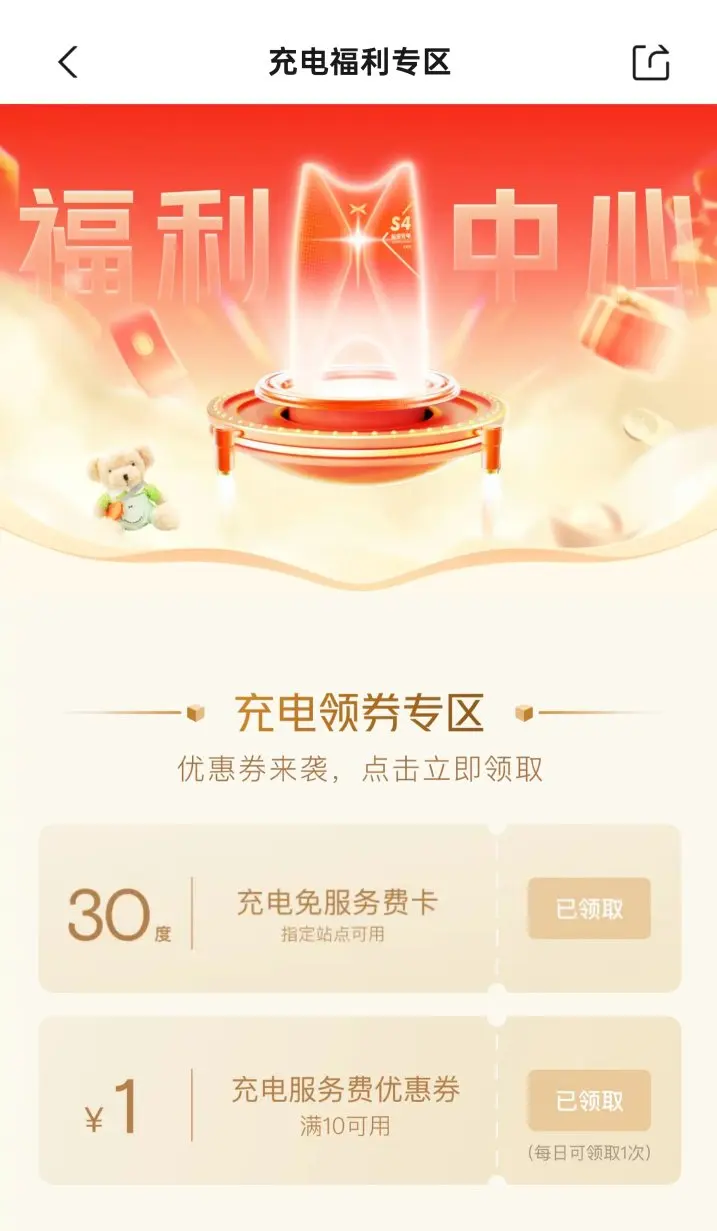 其次,国庆期间,小鹏还给鹏友们准备了相当丰厚的大礼。点开我们的app在“充电中心—充电福利”里面就可以看到,国庆送的30度免服务费抵扣卷噢。