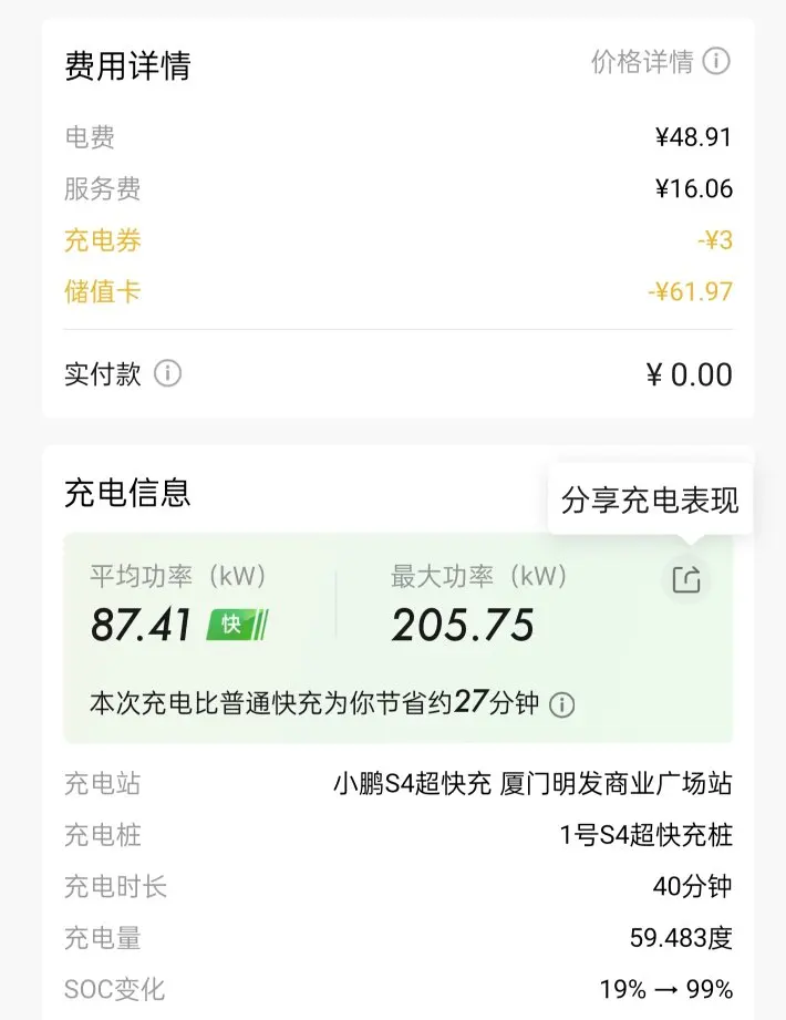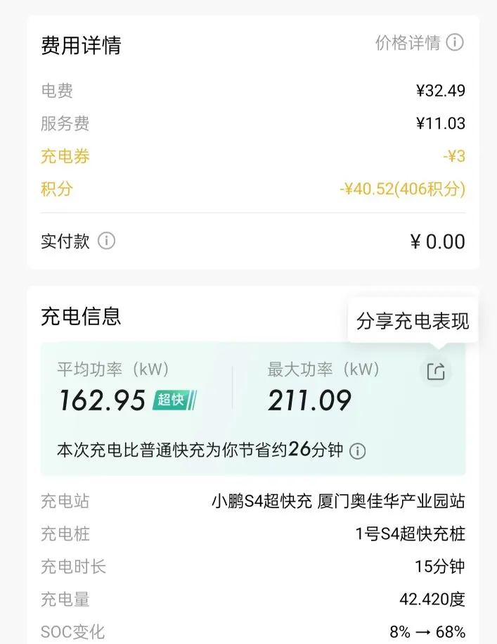 自从积分抵扣系统上线以后呢,我也是多次前往小鹏的充电桩体验,速度真是不要太快。