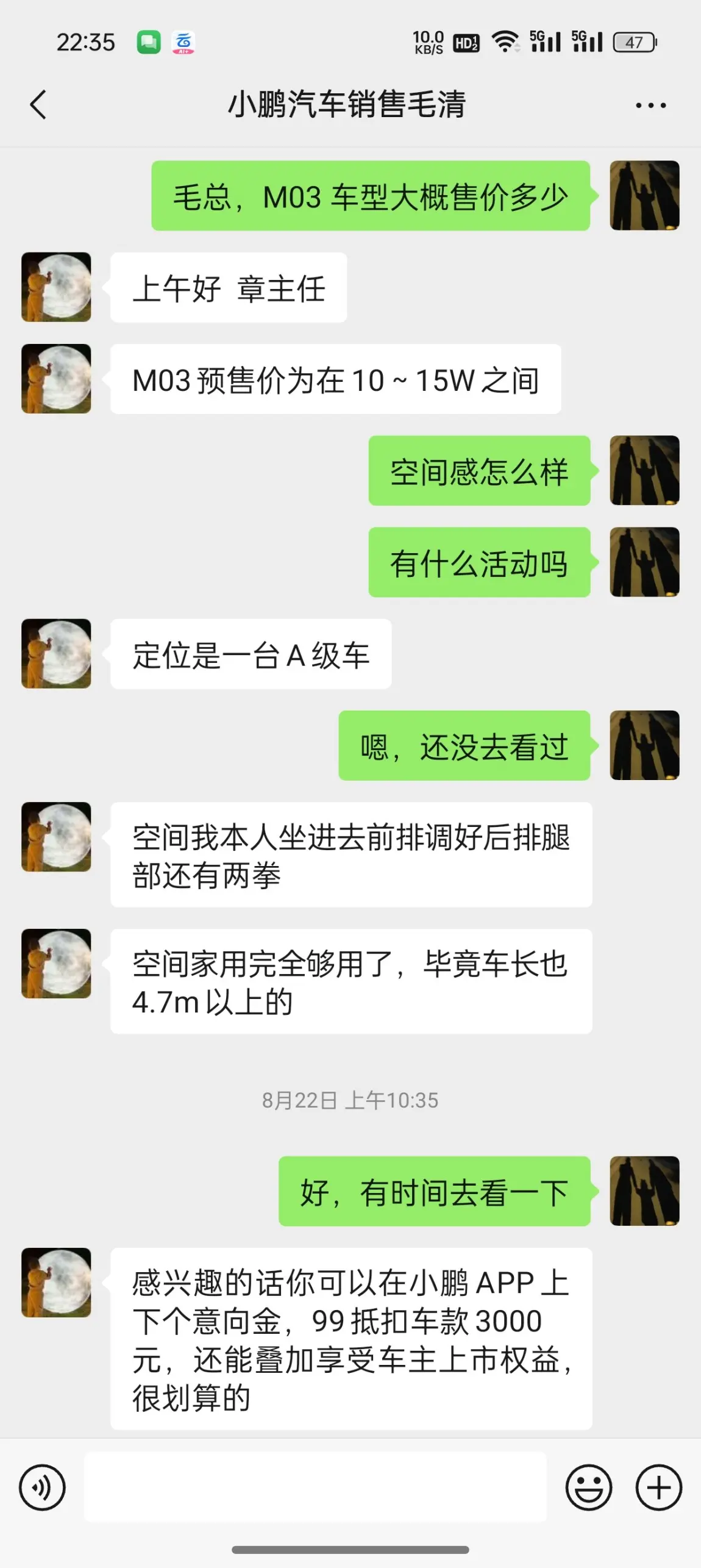 复购背景:复购之前,我家有 3 辆车,我的 G6,爱人的奥拓和 BM328i。8 月中旬,我和爱人换车开之后,发现油车费钱,200 油费不能满足我一周时间上下班通勤(每天 50 公里,周末双休),加油加得我心疼,因此,我就有让爱人换电车的想法,恰好我那时看到 M03 准备上市,我也问了当时 G6 的服务管家,他告诉我大概在 M03 大概上市价 10 万起。