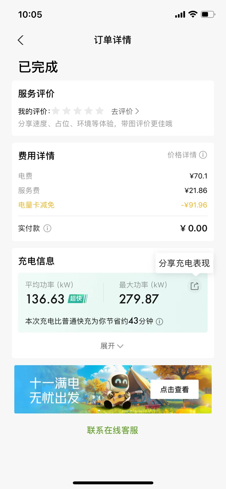 #小鹏超快充,电力全开# 走进十月的金秋,天高云淡,爽风拂面,大自然舞动着画笔,在天山之巅,在奎河之畔,在浩瀚大漠边关,在胡杨林的深处,秋叶血柒山谷的壮观,在缀满暮色婉约的小径上,尽悄挥毫,喷洒浸染。我喜爱秋天,马上到来的国庆假期准备带着家人去寻秋,赏秋,领略金秋最美人间。我喜欢自驾带着希望出发,我的G6上次充电后行驶了613.6公里,表显还可跑68公里(我的是755长续航,充电设置是95%),G6真的续航扎实,毫无出行压力!出行前去加满电(电力限制到90%),充满电比普通快充节省了43分钟,真是神速!在接下来的假期,充满期待充满电,电力全开,幸福出发,去寻多彩收获的秋!@充电小助手