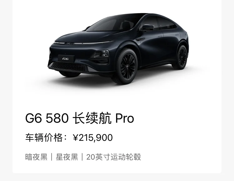 选择G6的原因:本来打算选择M03的,但是考虑到车内空间和底盘高度最后还是选择G6。试驾的时候体验了自动泊车,感受还不错,速度也很快。后排空间很大,家用很强。特意选配了黑武士,颜值很高。