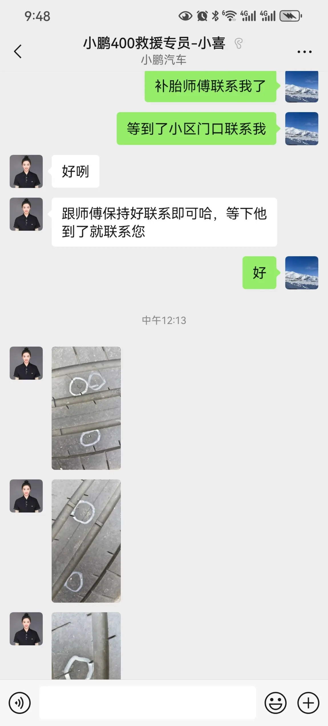 首先在烟台的管家服务群联系了我的鹏管家,没想到假期也马上就回复了,鹏管家指导我联系了救援专员小喜,小喜又帮我联系了补胎师傅,下面算正式进入维修流程。