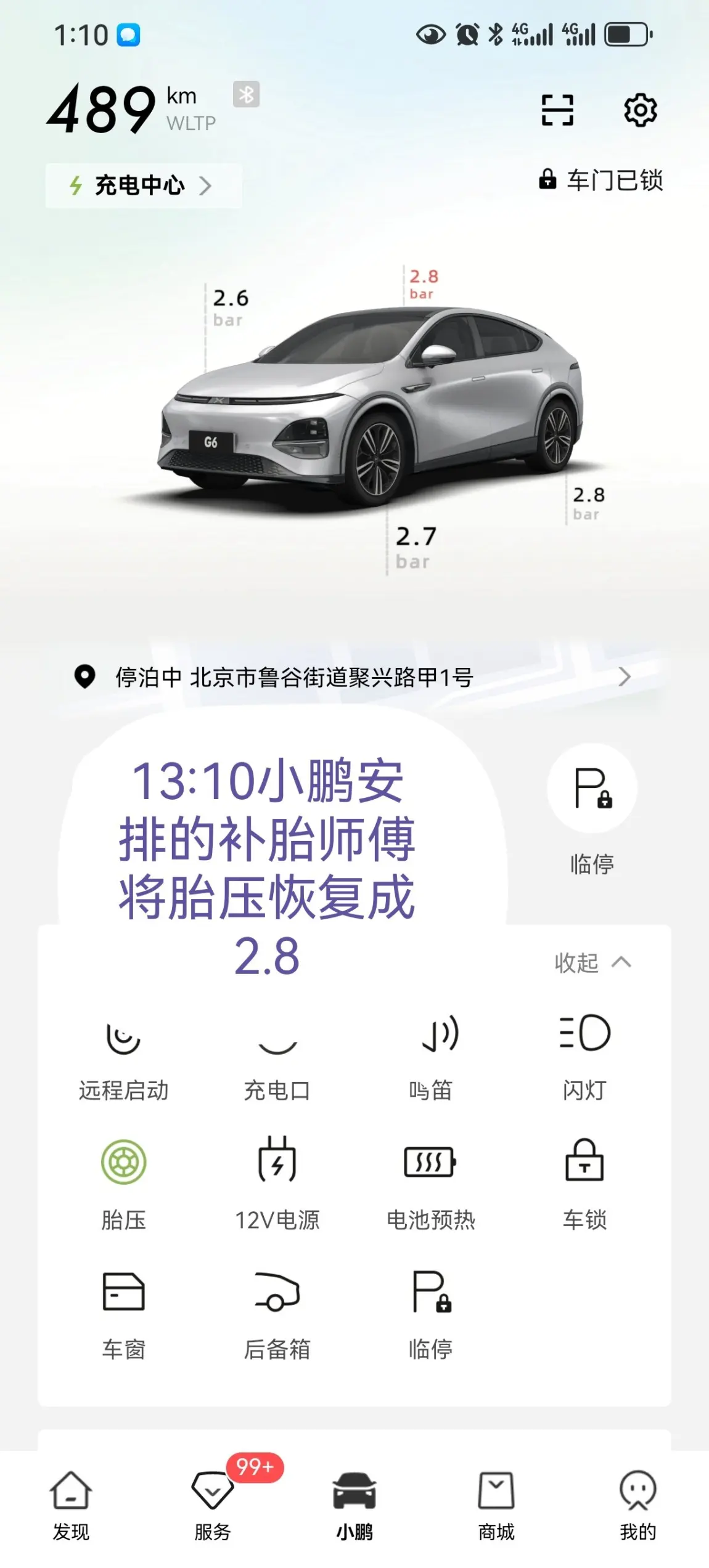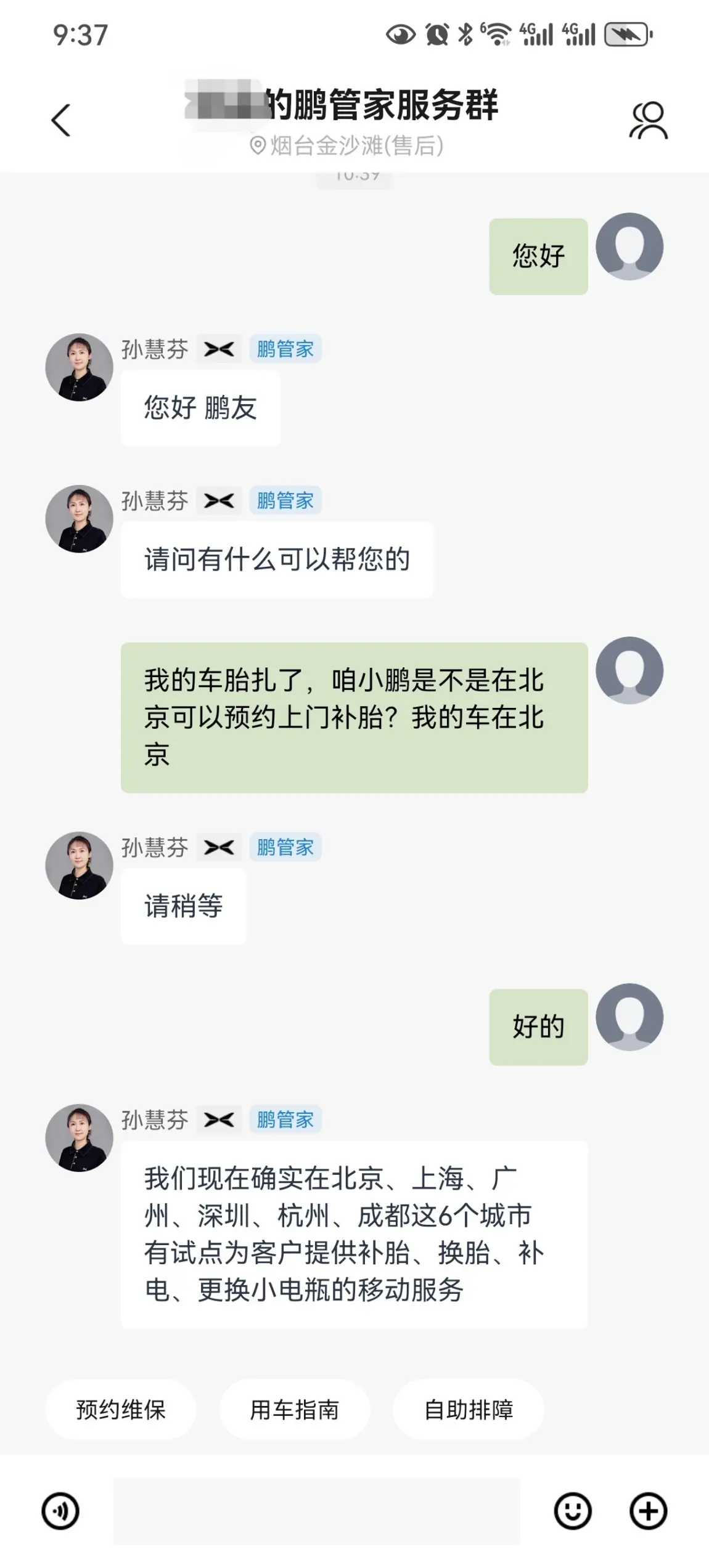 #小鹏暖心服务# 2024年10月4日到达北京,5日上午9点发现右后胎压只有1.7,判断是扎胎了,突然想到小鹏可以提供上门补胎服务,查询后发现北京在可服务的城市名单里,我这山东车主歪打正着可以体验一下了。因为车辆无法使用,我就坐妹妹家的车先出门,后续动作完全通过手机进行。