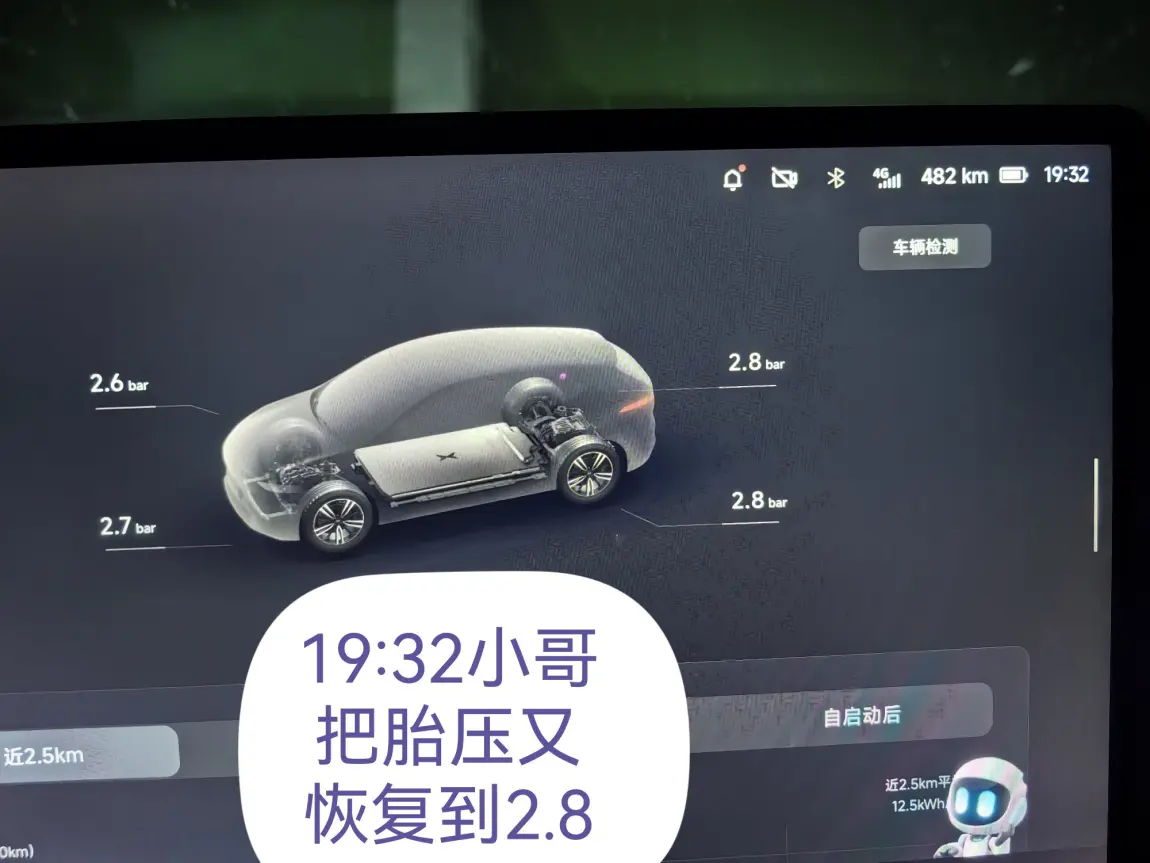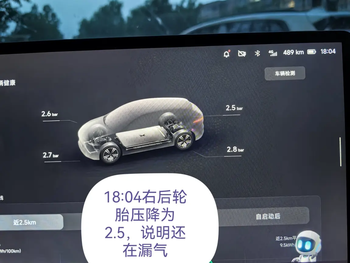 晚上18点回到车旁,胎压掉了0.3成为2.5,联系小鹏补胎师傅,让我再观察一下明早再看看。