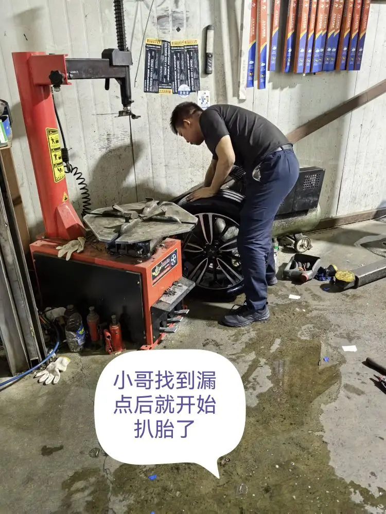 搜索地图,找了一家比较近的修车店,连门头都没有[笑哭R]就一个小伙子还在,说明情况后就开始拆胎,卸下来一边滚动一边用水壶喷水,10秒钟就找到了漏点,那后续工作就简单了,行云流水解决问题。
