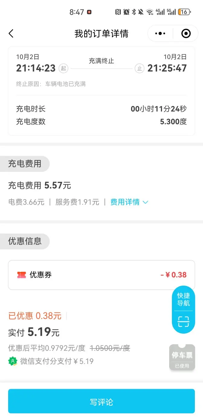 节前一天,提前在s4充电到90%,回小区继续用慢充,充到100%,慢充充了16.11度,花费14.65元。10月1日深圳出发至湛江,由于堵车,到阳江先休整一下,避避堵车高峰,中午吃完饭在阳江福朋喜来登酒店小鹏充电站补电。由于3号要去南极村,单程172公里,还要去下一个城市,路途还是有点远,10月2日晚上提前在湛江万达广场店提前充电到90%,本来想回酒店再用慢充充满,没想到酒店充电桩也是快充,11分钟充了5.3度电,花费5.19元。