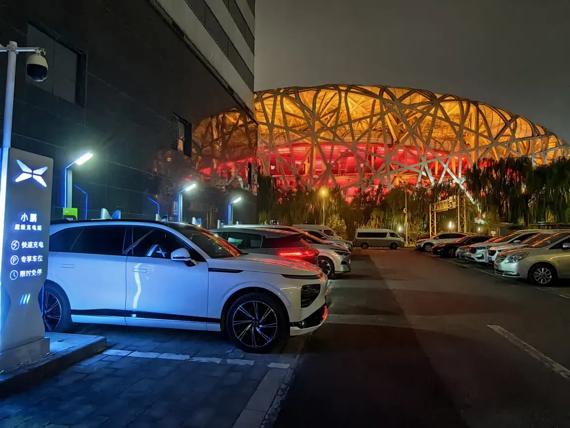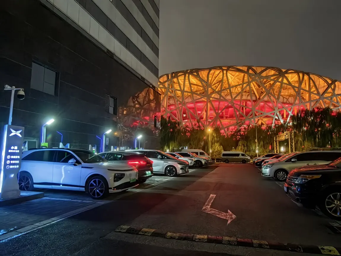 北京鸟巢附近来一组照片。在格兰云天酒店停车场有一个超充和5个快充。快充也很快,半小时内10%到9%。去酒店厕所方便一下,看看景色就过去了能。旁边的G6P7G3i充电中。现在凡是出门走大道的都是智驾NGP来开。晚上不如白天表现好。小道人多的地方自己开更好。