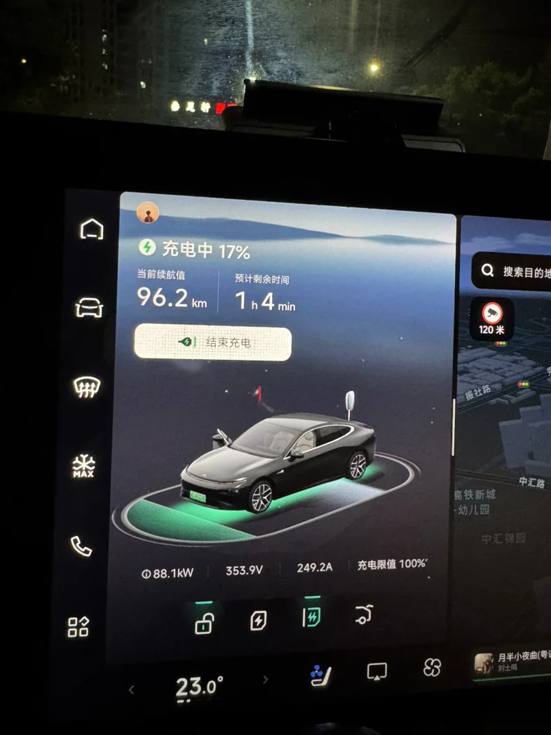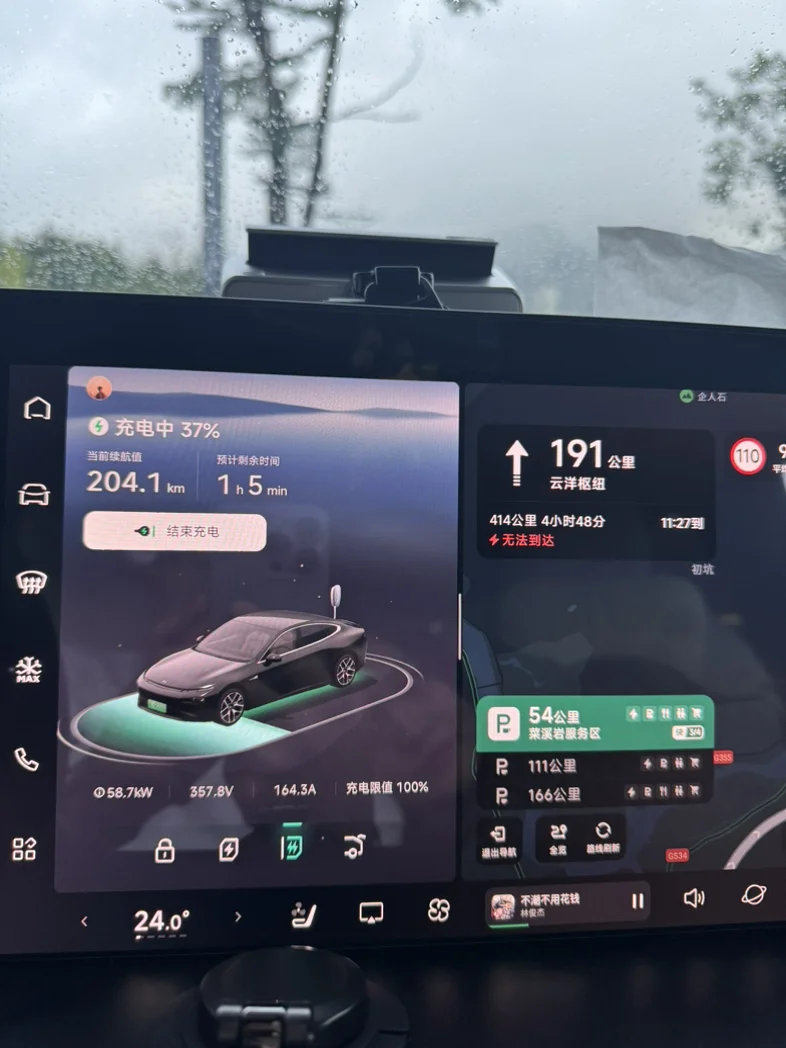 还有一些电车长途经验分享给大家,如果全程高速没必要提早规划充电点因为实际可能到那个点会没有充电桩。好就是续航剩余两百公里后,开始在app上或者车机导航上留意哪个服务区有充电桩,有桩就去服务区充电。到剩余100公里续航后,可以准备找路口下高速去补能,这样往往会更高效、保险。希望鹏友们出行顺利,用车开心。
