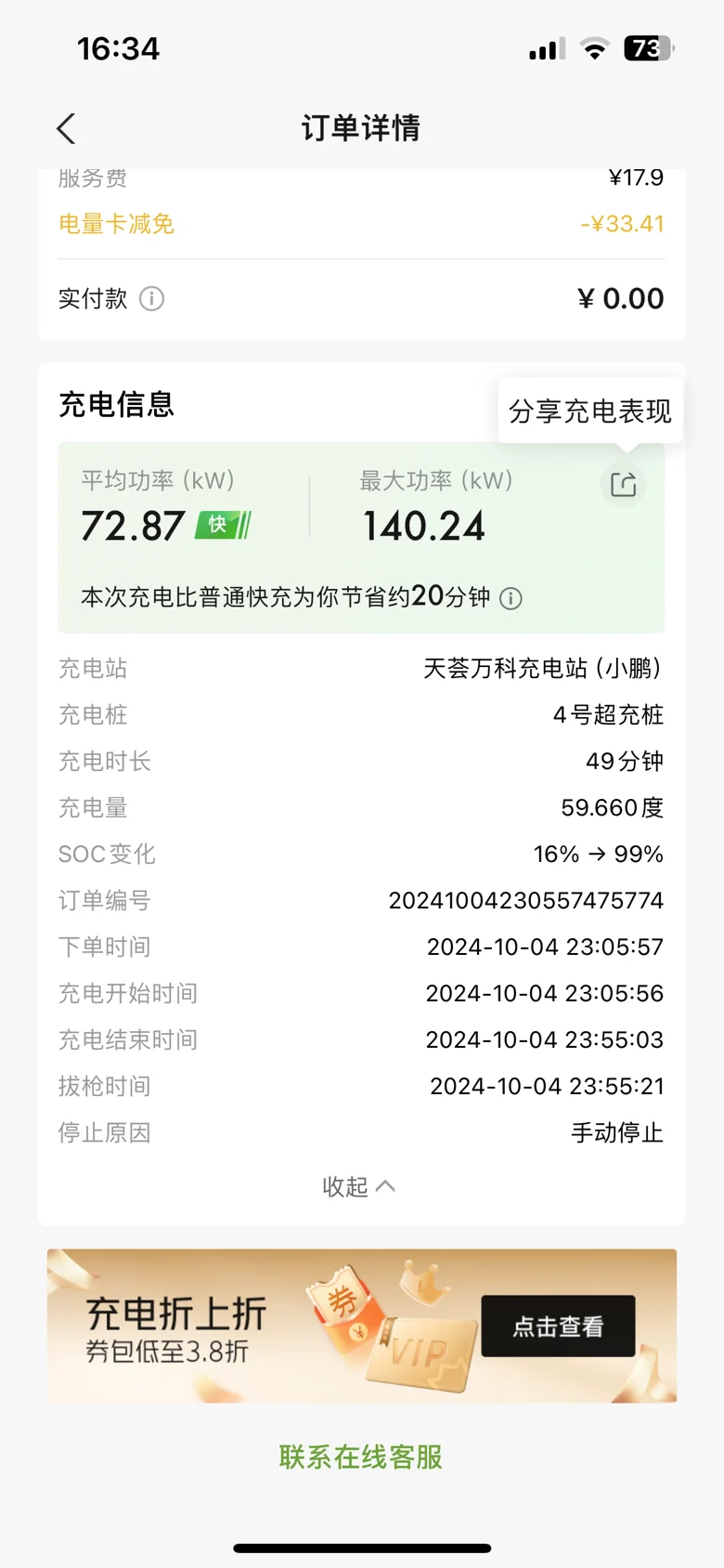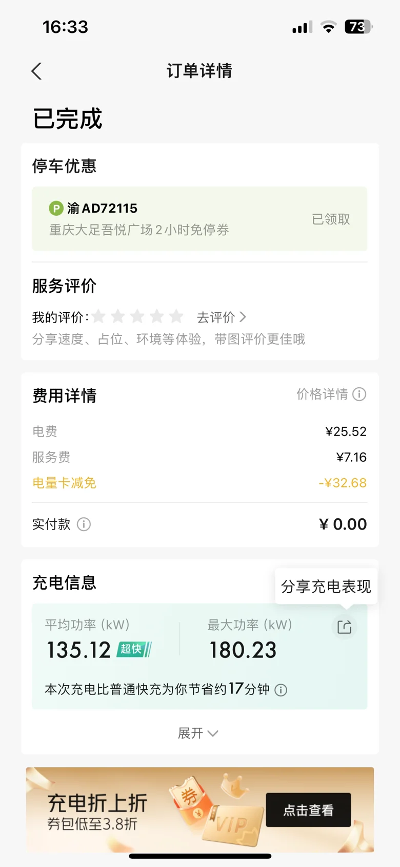 #小鹏g6用车惊喜时刻#国庆节假期开着小鹏g6来了一次长途旅行,重庆到成都,全程400公里,早上在家充满电455的续航,满电出发啦。全程高速,开着高速ngp,速度保持在110公里左右,到达成都时,电量还剩16,赶紧找个小鹏超充站充电,插上充电枪就能自己充电,这点好评,不用像第三方充电桩还要扫码,充电速度也快了不少,关键电价还便宜。回程的时候,也是全程高速,到了大足补了一点电,正好吃点东西电就充好了。现在节假日也没有充电焦虑了,要是小鹏在高速上建一点充电桩就好了,就不用中途下道补电了。
