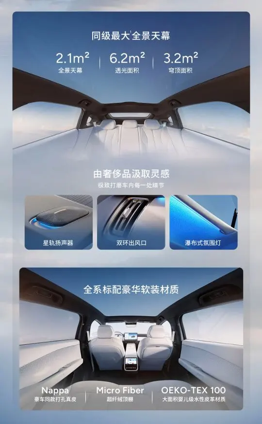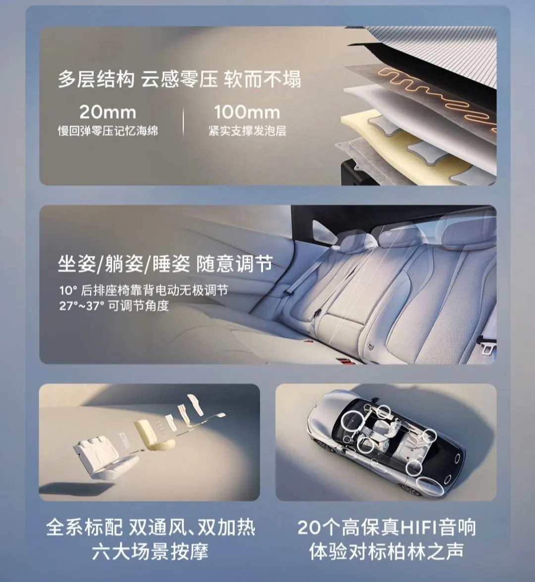 内饰方面,小鹏 P7+沿用了家族式的极简风格,采用浅色系内饰配色,营造出了温馨舒适的驾乘环境。前排配备悬浮式液晶仪表和大尺寸中控屏,显示清晰,操作便捷。后排座椅前方中央扶手的末端配备小尺寸显示屏,方便后排乘客控制娱乐系统及后排座椅和空调等。全车 4 个座椅均标配通风、加热和按摩功能,这在同级别车型中是非常罕见的,为乘客提供了更加舒适的乘坐体验。此外,HIFI 高保真音响、星瀑式氛围灯和全景天幕等配置,也进一步提升了车内的舒适性和科技感。