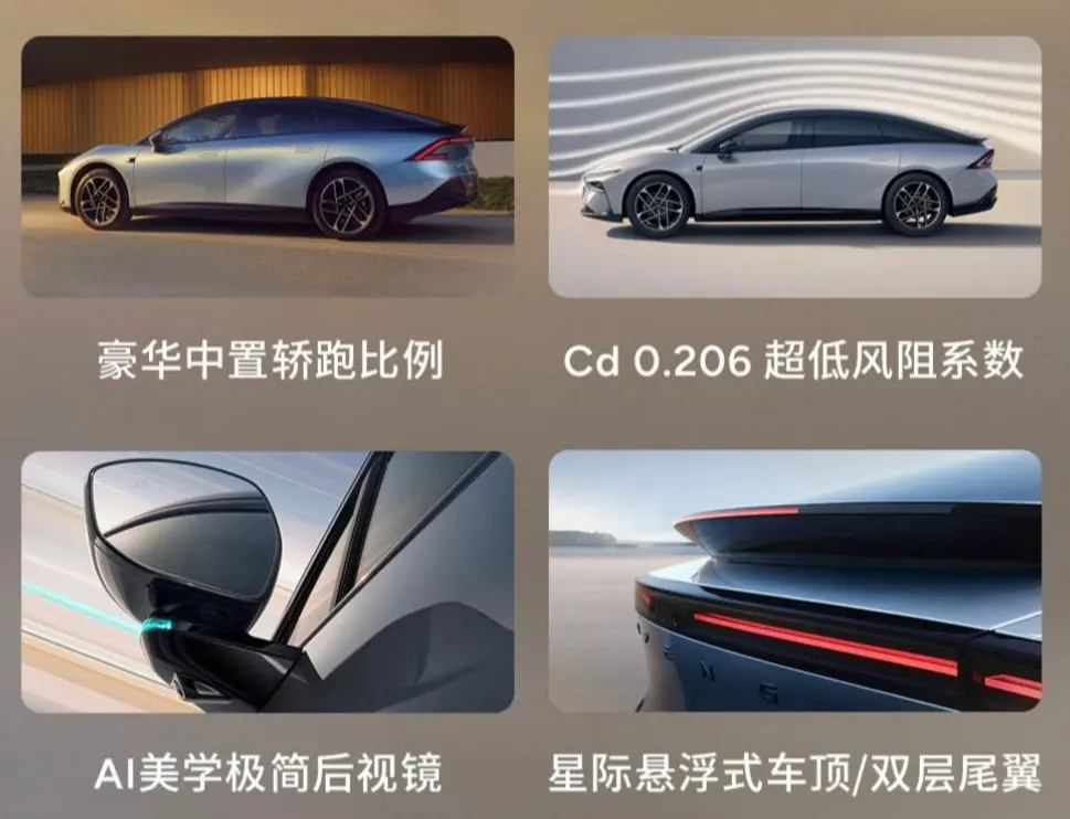 小鹏 P7+在外观设计上给人留下了深刻的印象。其采用的“星际穿梭”设计主题,融合了 AI 美学与飞行汽车 X2 的设计风格,打造出了极具未来感的悬浮掀背造型。溜背式的车身线条流畅自然,不仅视觉效果低趴,还为整车带来了出色的风阻系数,仅为 0.206cd,这在同级别车型中处于领先水平。前脸的环状式灯带依然具有很高的辨识度,与贯穿式尾灯组相互呼应,使车辆在夜间行驶时具有极高的辨识度。车尾的双层尾翼设计更是点睛之笔,为车辆增添了一份运动感和科技感。不过,车尾的设计也引发了一些争议,有人认为与奔驰 EQXX 概念车相似,但在我看来,这或许是一种设计上的巧合,毕竟在追求极致的空间、风阻和美观的平衡时,优秀的设计往往会有一些相似之处。