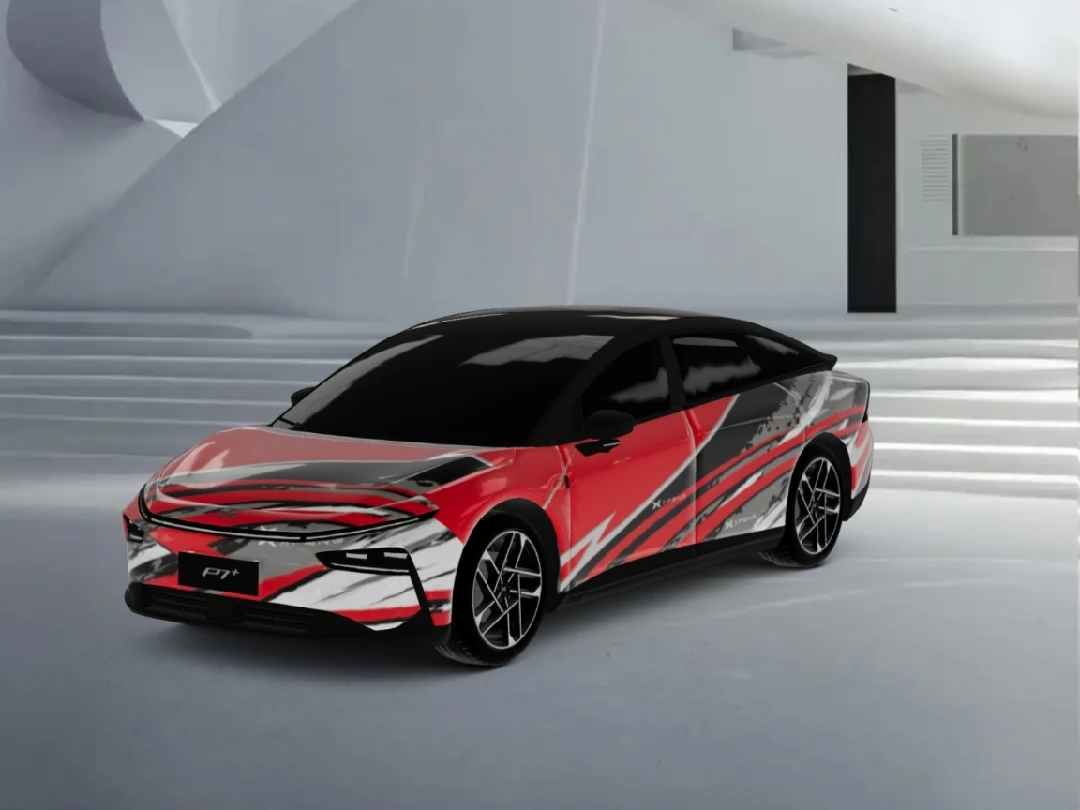我觉得这款涂装和p7+的融合度还是比较高的,车身的微微向上⬆️的涂装线条设计让P7+看起来运动感十足,前脸和贯穿式灯带和融合的很不错,前脸的涂装是大家从后视镜可以看见的,所以不是很复杂且保留了白色原车漆的涂装让大家不会感觉到突兀,且有很高的辨识度。