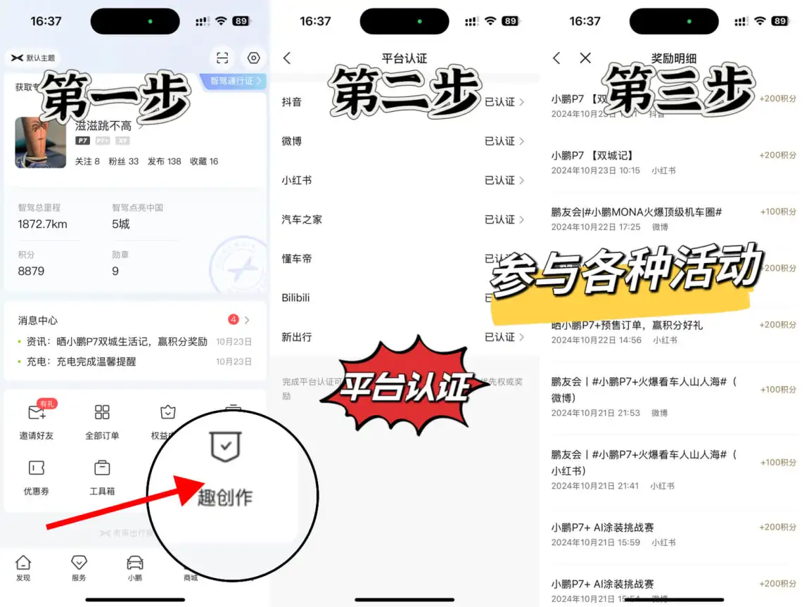 以上是我的一个步骤,有多平台认证,这个很简单啦,申请注册个账号即可。然后每天关注趣创作里的活动就可以,因为有时间和人数限制。所以要多多关注哦~~~