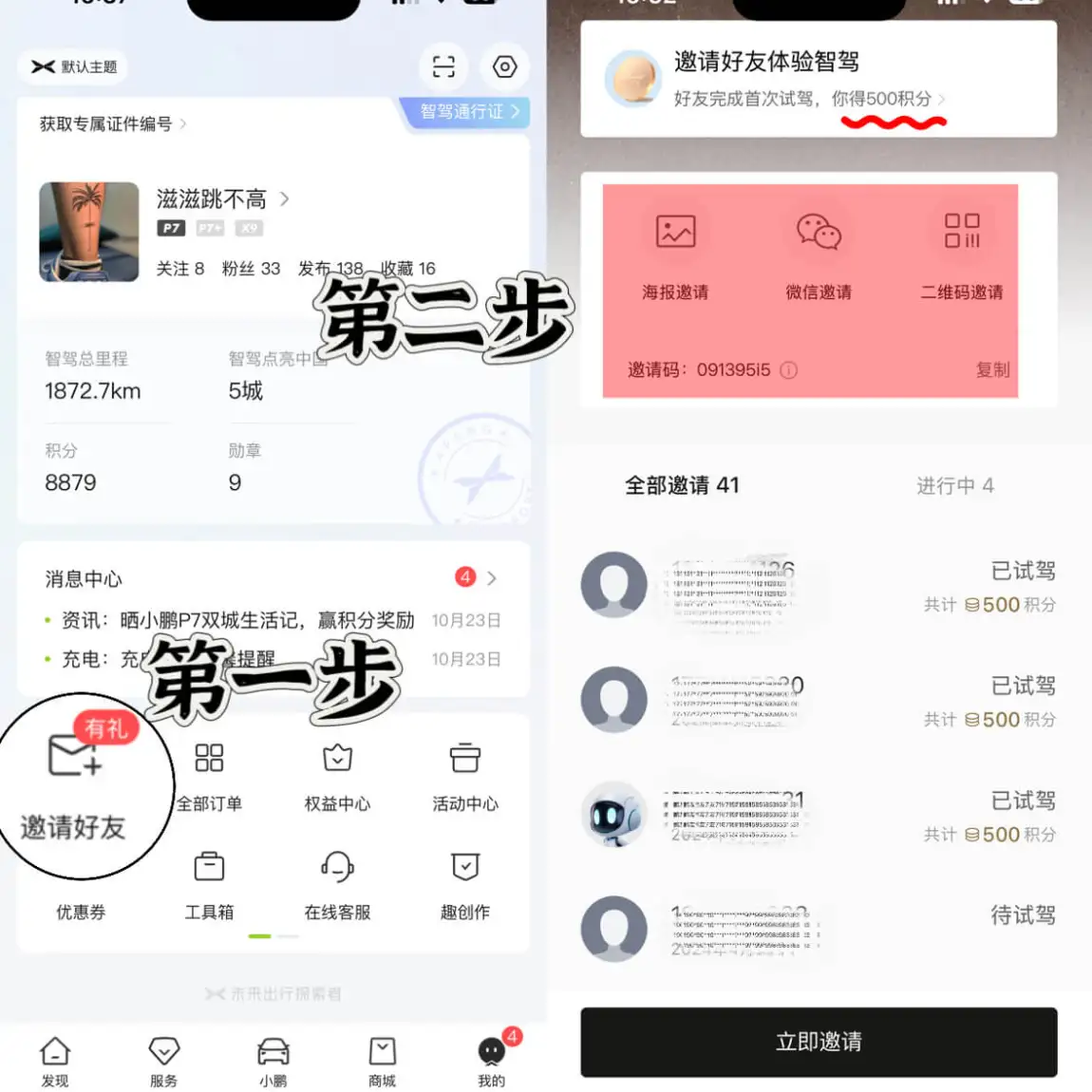 1)邀请好友试驾,只要你邀请的朋友之前没有去试驾过小鹏的车(新手机号),那他去了,你就躺赚500积分(50元钱)。一个月20次邀请,一共能挣10000积分(1000元钱)。