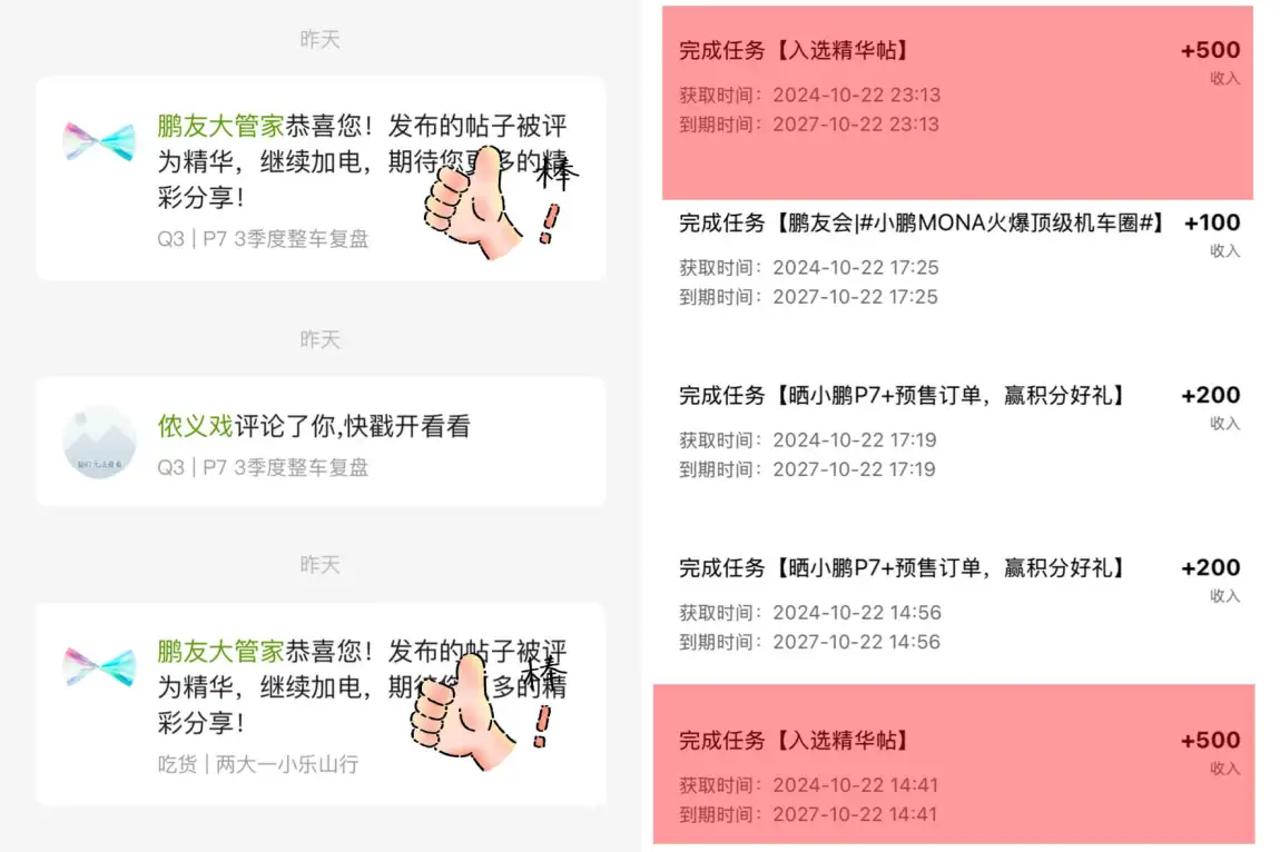 2)写文章,比如我,没事想想点子找找话题,写写文章给社区的鹏友们乐呵乐呵。也是不错的选择,你的文章只要图片>=6张,文字>=200字或视频>=30秒文字>=50字,都有可能被社区的小姐姐小哥哥添加精华标识,价值500积分,相当哇噻。当然不可能这么轻松。一定要有感而发,聊小鹏周边、要具体化内容。但一想其实也简单,开车拍个NGP、LCC的用车场景也可以。所以大家可以尝试,一次没成功,再来一次,还不成功再来三次。一定会有进度然后赚取积分。写文章一个月10次,一共能挣5000积分(500元钱)。