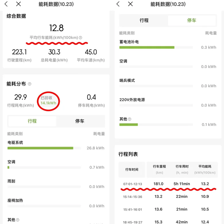 这次调休日自驾胖虎出游期间有一段行程是需要先送包我车回老家的邻居,送完后,我便沿着山间蜿蜒的车道行驶,当然也感受到自驾胖虎跑山的快乐,上坡、下坡,弯道曲曲折折,更留心感受了秋日里胖虎能耗表现!在10月23日这一天里,我的胖虎也行驶了223.1km,当日平均行车能耗仅为12.8kwh/100km!不仅如此,在07:01~12:13近5个小时里跑山181km,平均能耗也只有13.2kwh/100km。