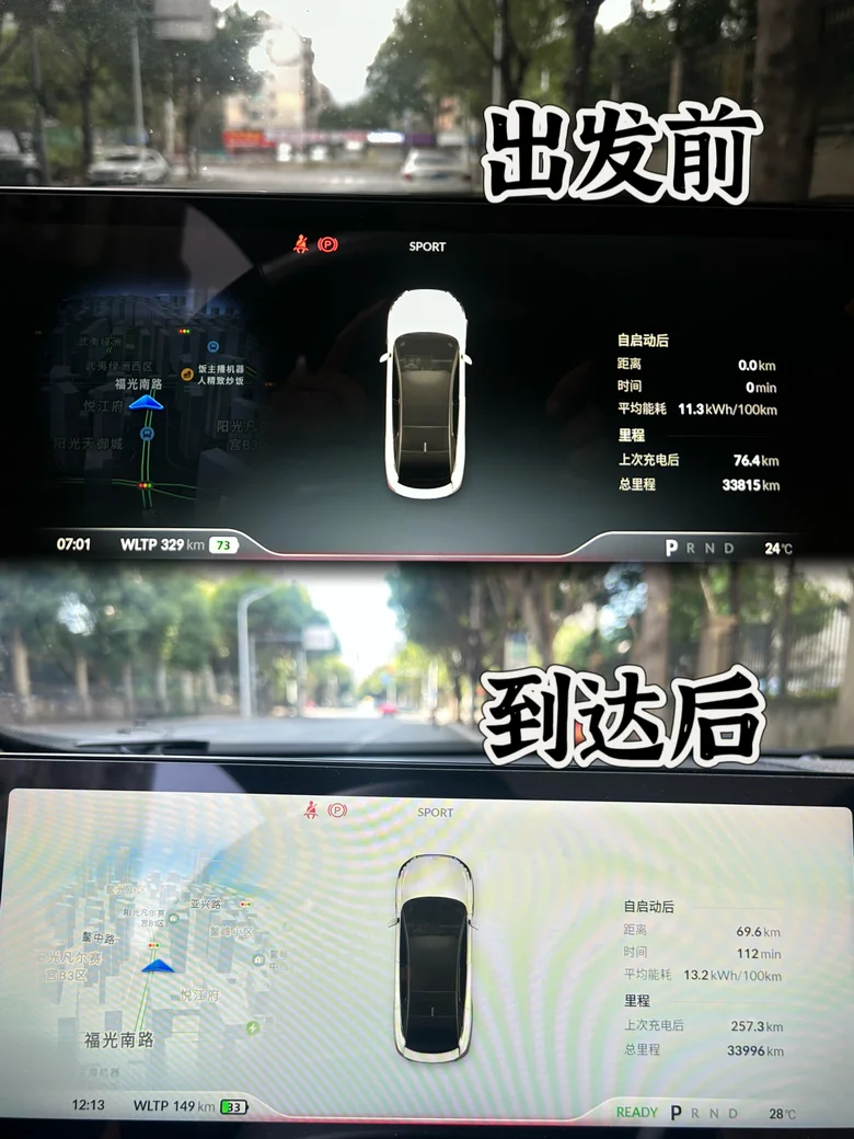 ①出发前:总里程33815km,wltp续航329km,电量73%