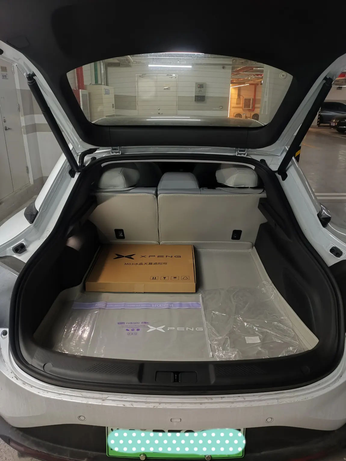 宽大的后备箱,装着小鹏赠送的遮阳顶棚和植绒脚垫,我自己还准备了后备箱垫儿。