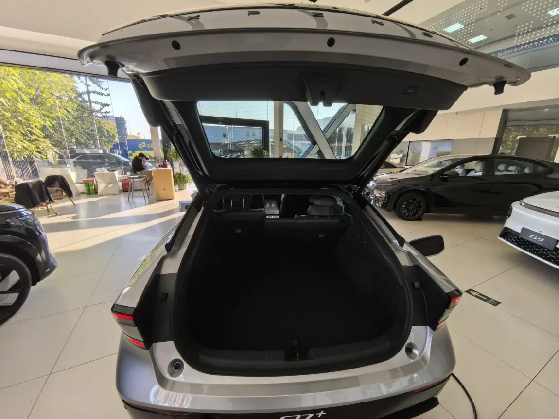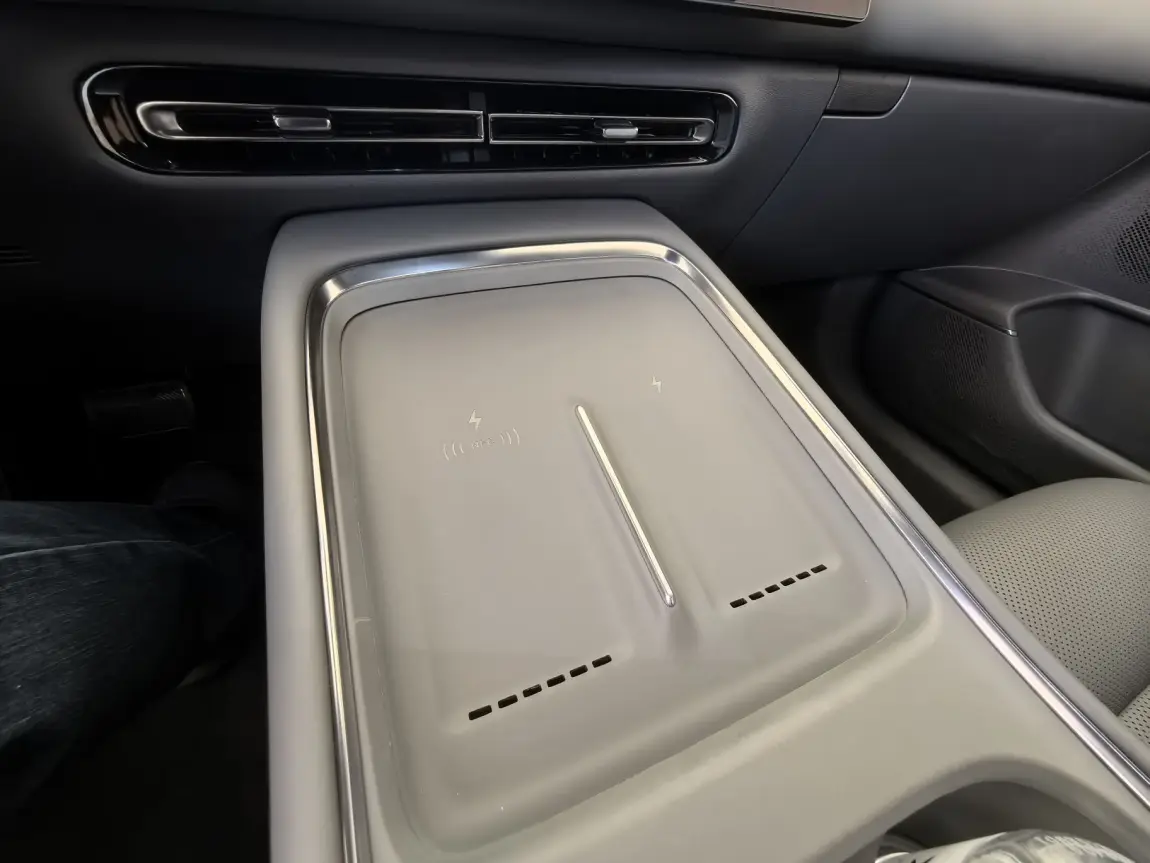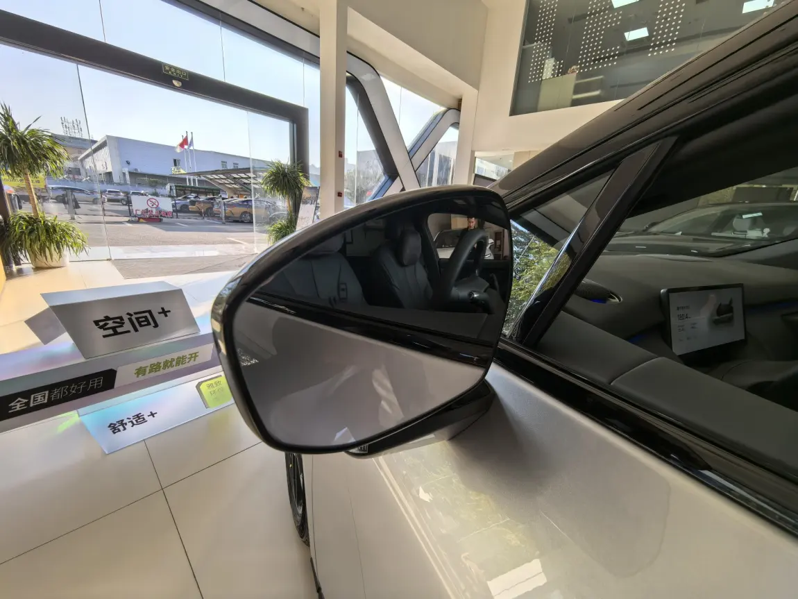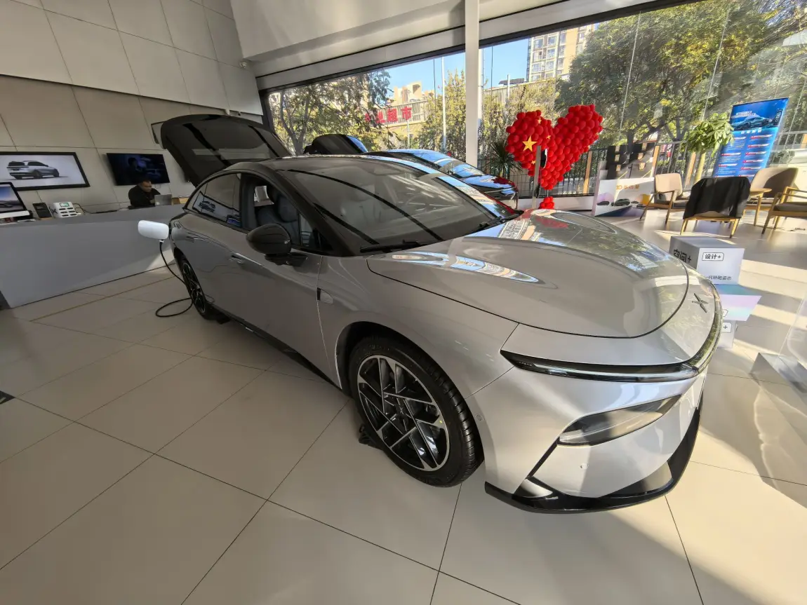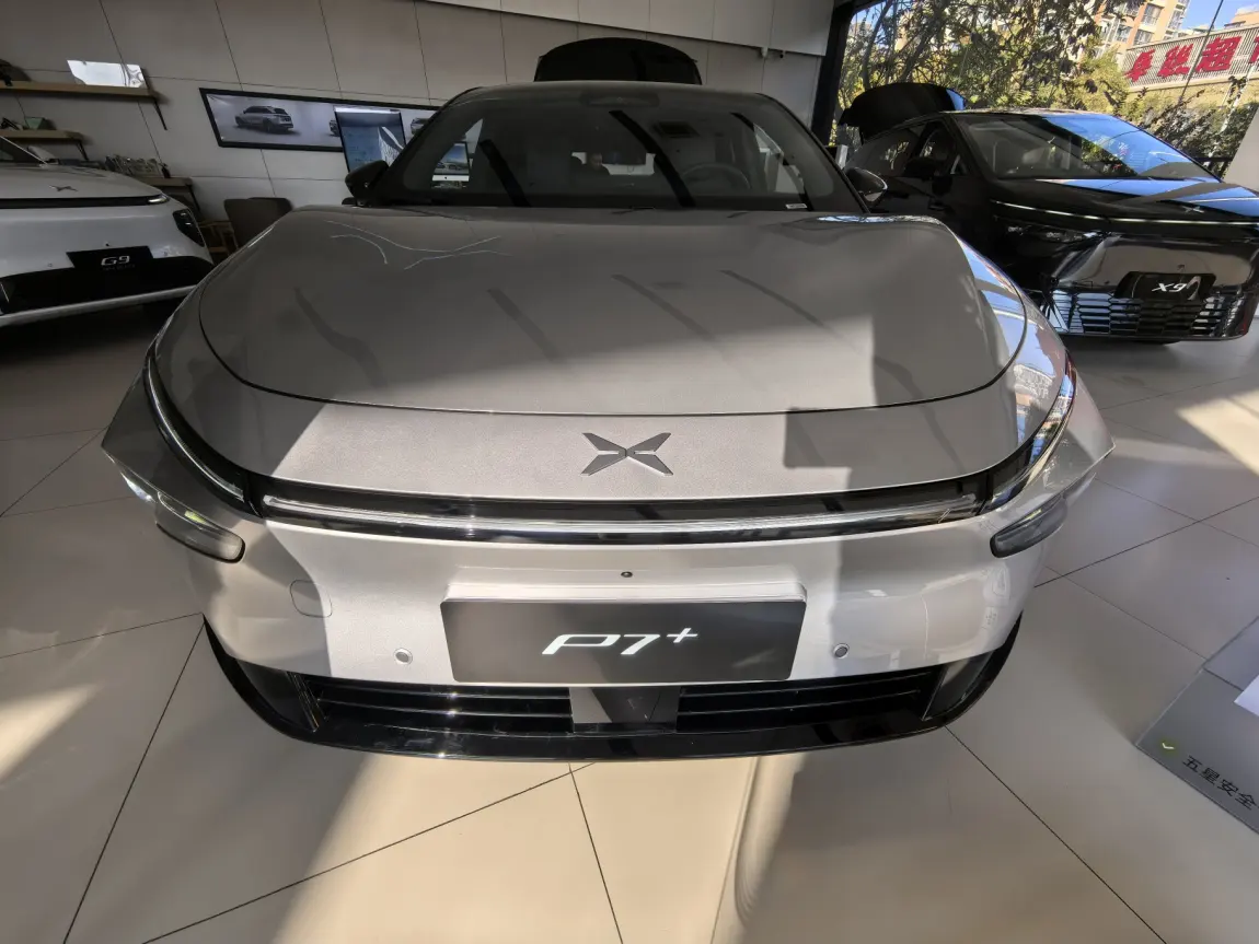 一进入店内,我就被这款主打色为新月银的小鹏P7+所吸引。车身线条修长优雅,黑色悬浮式车顶与贯穿式星环日行灯相得益彰,呈现出强烈的科技感。前脸延续小鹏“Robot Face”的家族式设计,大灯组点亮时,视觉感受更为柔和,充满了未来感。