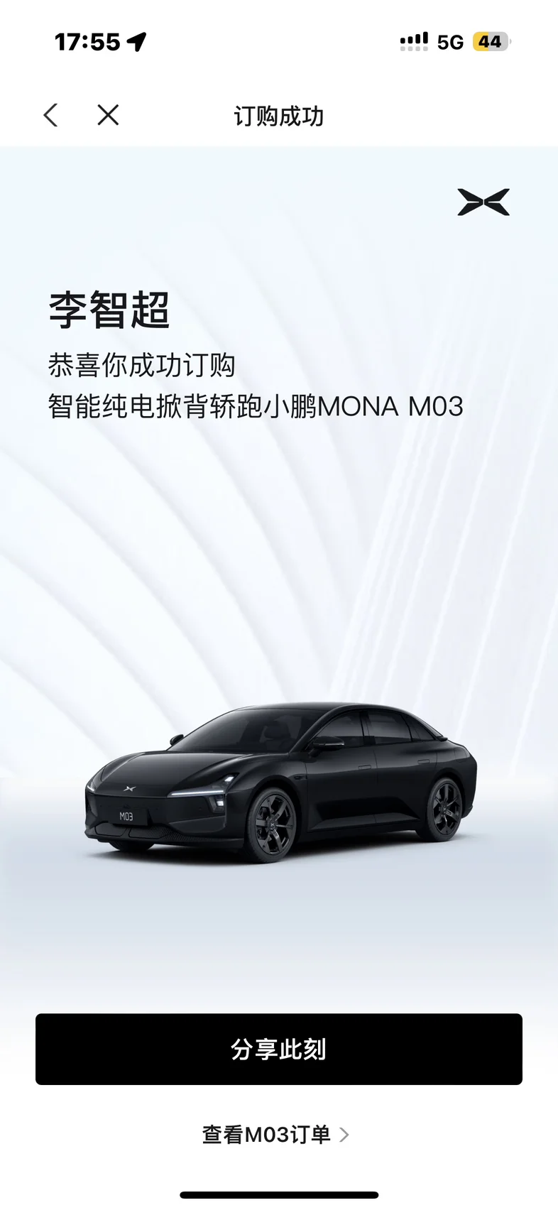 #晒小鹏MONA M03大定锁单# 因为mona了解小鹏!因为mona 爱上小鹏!作为一名马上毕业的大学生,在了解到mona 以后就被mona 深深吸引了!对于我来说颜值,智能化,大掀背!一切一切都让我如此心动!我人生的第一辆车就是mona!