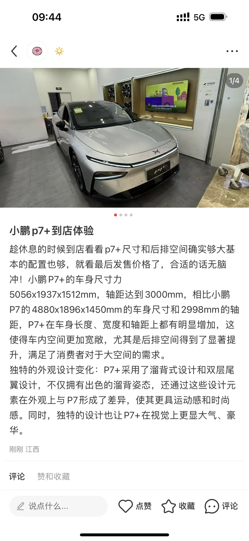 趁休息的时候到店看看p7+尺寸和后排空间确实够大基本的配置也够,就看最后发售价格了,合适的话无脑冲!小鹏P7+的车身尺寸力5056x1937x1512mm,轴距达到3000mm,相比小鹏P7的4880x1896x1450mm的车身尺寸和2998mm的轴距,P7+在车身长度、宽度和轴距上都有明显增加,这使得车内空间更加宽敞,尤其是后排空间得到了显著提升,满足了消费者对于大空间的需求。独特的外观设计变化:P7+采用了溜背式设计和双层尾翼设计,不仅拥有出色的溜背姿态,还通过这些设计元素在外观上与P7形成了差异,使其更具运动感和时尚感。同时,独特的设计也让P7+在视觉上更显大气、豪华。