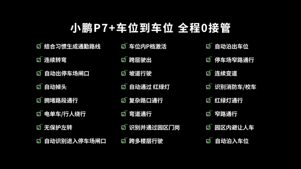 这个罗列出来了24个小项目的功能,看的人眼花缭乱,什么记忆养成路线,跨层驶出,自动识别进入停车场闸口,识别消防车和校车等等。已经无限接近于所谓的点到点的自动驾驶。虽然24年已经有很多友商利用第三方平台的技术不断的宣称无图驾驶,但是真正好用的一定是小鹏的这套系统,大家可以去试驾下真正的体验下。唯一的遗憾就是没有召唤功能,如果加上这个,下雨天就不湿
