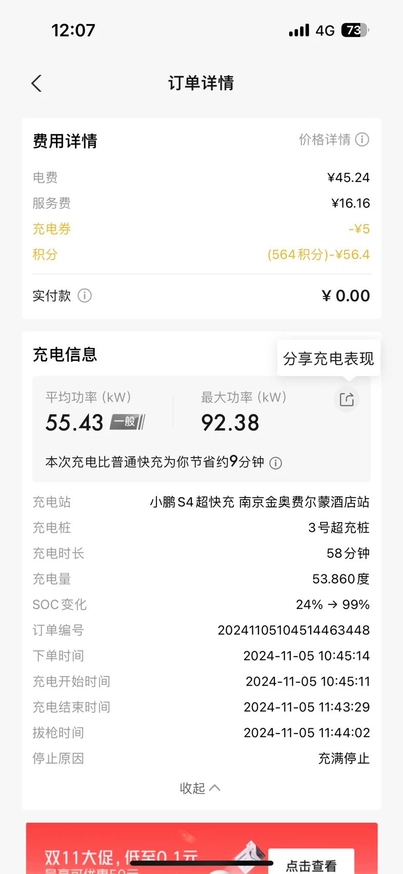 十一月一号提车到现在,准备开始充第一次电啦,使用了小鹏自营的快充桩,很方便充电速度也很快,在App上查找一下附近最近的自营站,里面还有路线指示图,很人性化,然后过去直接在App上操作,最后结束充电还可使用积分抵扣,真的太方便了,这样赠送的积分也有了大用处,首次充电结束后智能续航显示540公里,真的大大出乎自己的预料,况且智能续航基本能够做到1:1真的太优秀了,给小鹏三电技术点赞👍