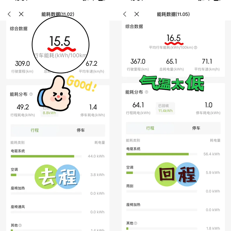 回程能耗相对高一点,可能跟当时跟凌晨的气温有关,室外 8℃,空调一直开的 26°,然后因为高速车少,能跑起来基本都在 120 左右,上图也能看出来高速平均速度比去程要高 10+个点。
