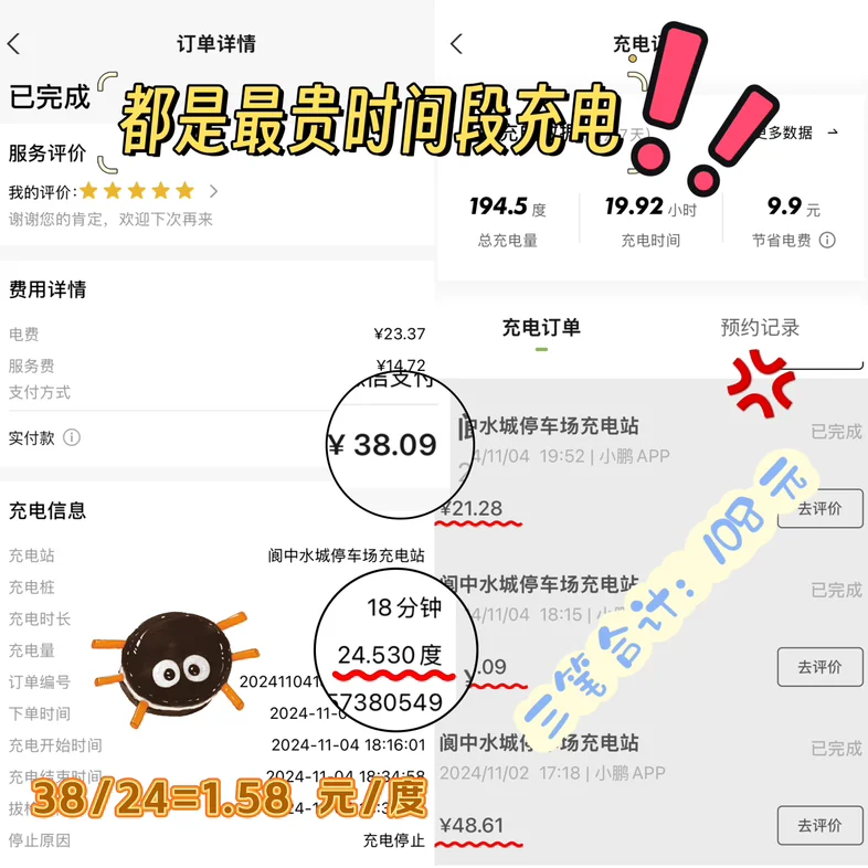 在阆中,都是使用超快充,而且偏挑最贵时段去充电🙃🙃,加上服务费,1.58 元/度,真的好吓人。随便补个能 3、40 没啦,所以大家别学我,没家充还是择时便宜时段再充点,我…主要懒ಥ_ಥ。共计两天一共话费 108 元电费。