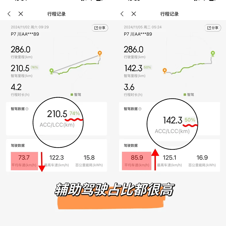 整个高速基本都在使用辅助驾驶 LCC&ACC,整个过程很轻松,去程使用率高达 74%,回程因为大雾天气使用率 50%,整个 800km 能耗也是控制在 15.x kWh/100km,其中还包括乡道的极限上山下山落差。