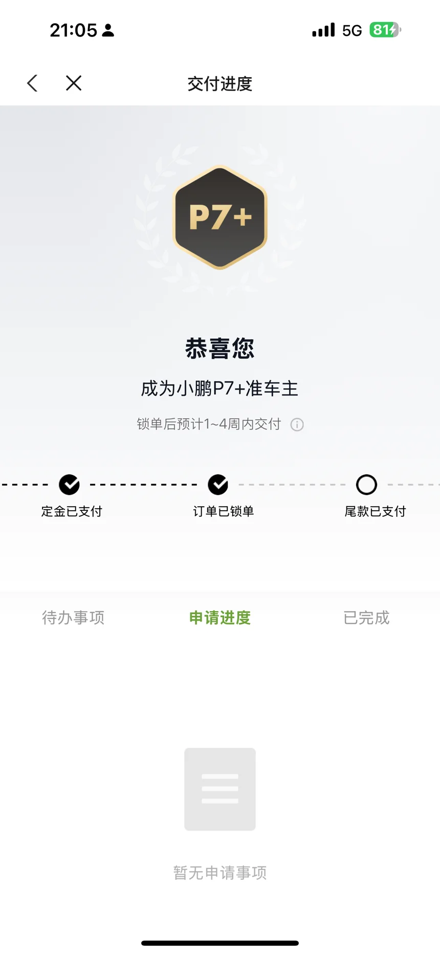 跟随销售的一步步指引 从发布会开始一直到最终出定价 赶紧打开订单转大定 结果咧 卡死了 太疯狂了 得亏最终守得一辆p7+ 期待尽早交付吧