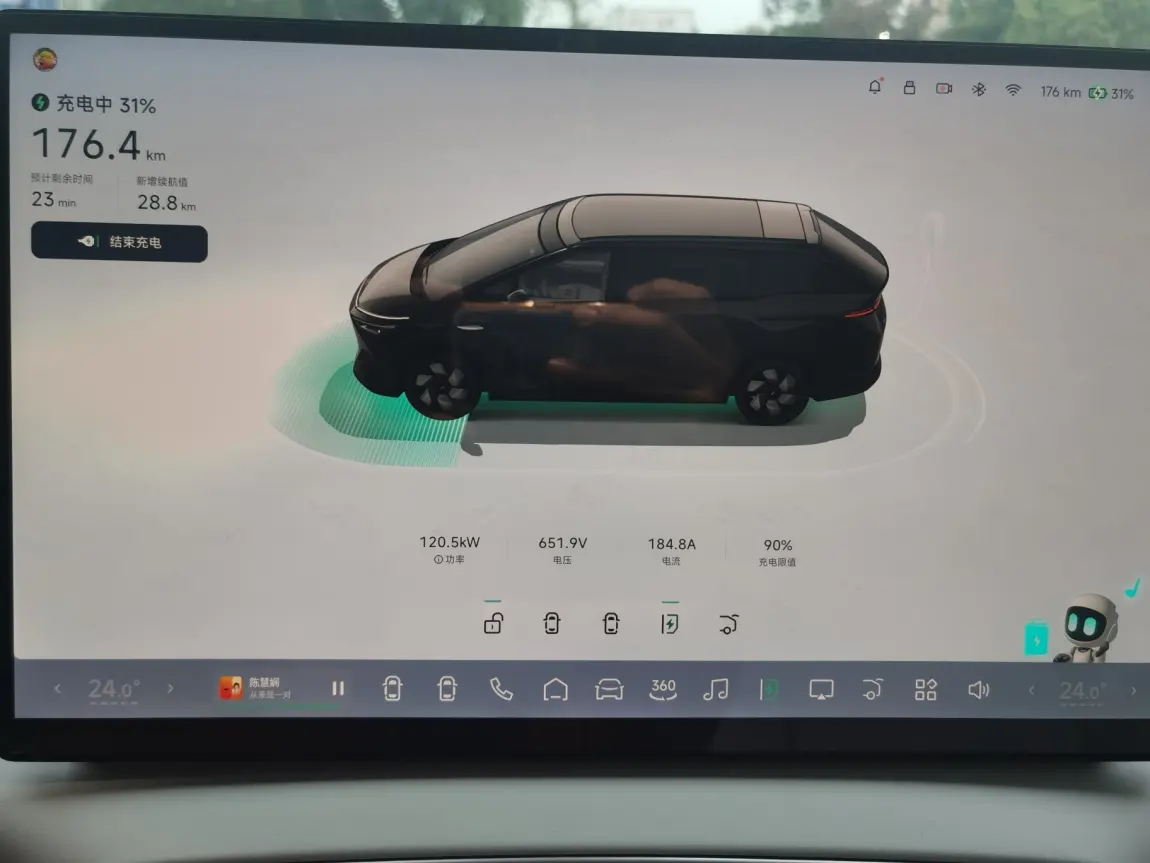 6. 充电参数:界面还展示了车辆的其他关键充电信息,包括“120.5kW”的充电功率,“651.9V”的电压和“184.8A”的电流,以及“90%”的充电限值,这些数据为用户提供了关于车辆充电状态的详细信息。