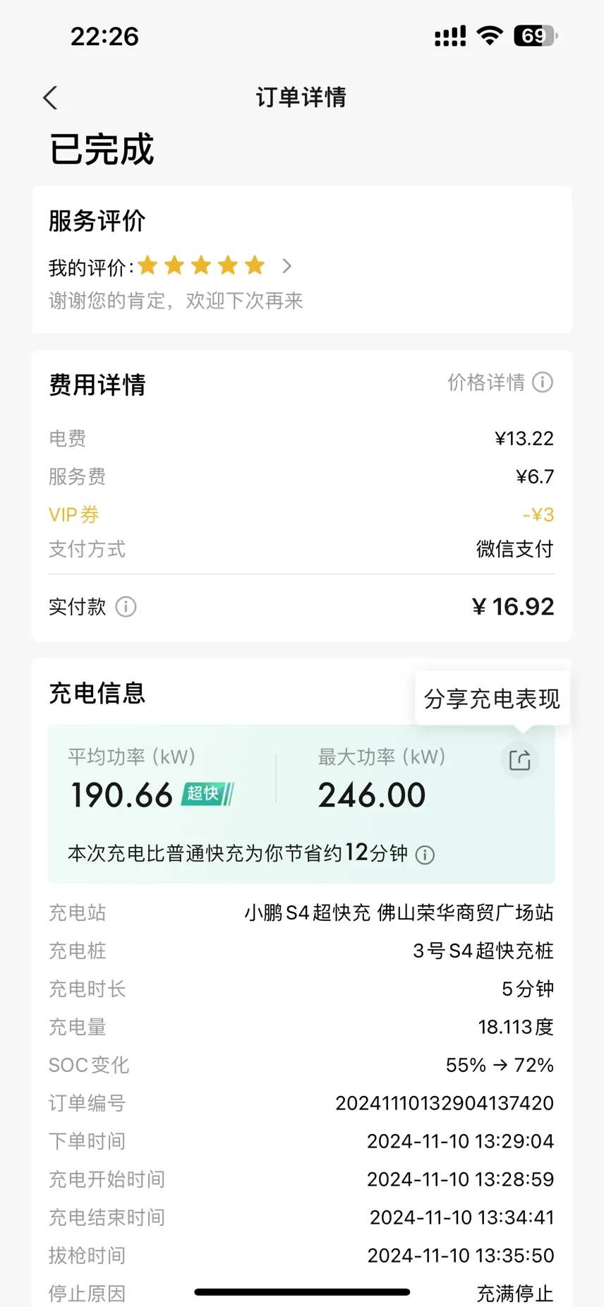 荣华商贸广场小鹏S4超快充——充电速度嘎嘎快! #小鹏超充就是好#不得不说超充站就是爽,充电速度嘎嘎快,超级给力,加上小鹏G9的800伏平台,为出游省下不少时间,5分钟充了18度电,最大功率246KW,平均功率190KW,我比普通快充节省12分钟,小鹏S4充电站真的是太猛了,如果有出游西樵山的朋友需要充电的,真心建议选择荣华商贸广场小鹏S4超快充。