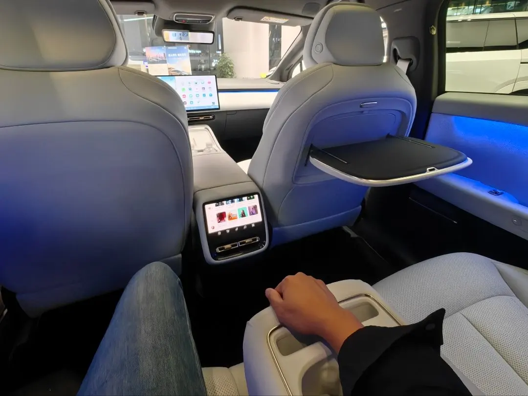 内饰空间很大,第二排靠背可调,长途驾驶很友好,还是电通调节很高级。后排还有个小桌板,老板在车上吃个方便面很方便,很接地气。