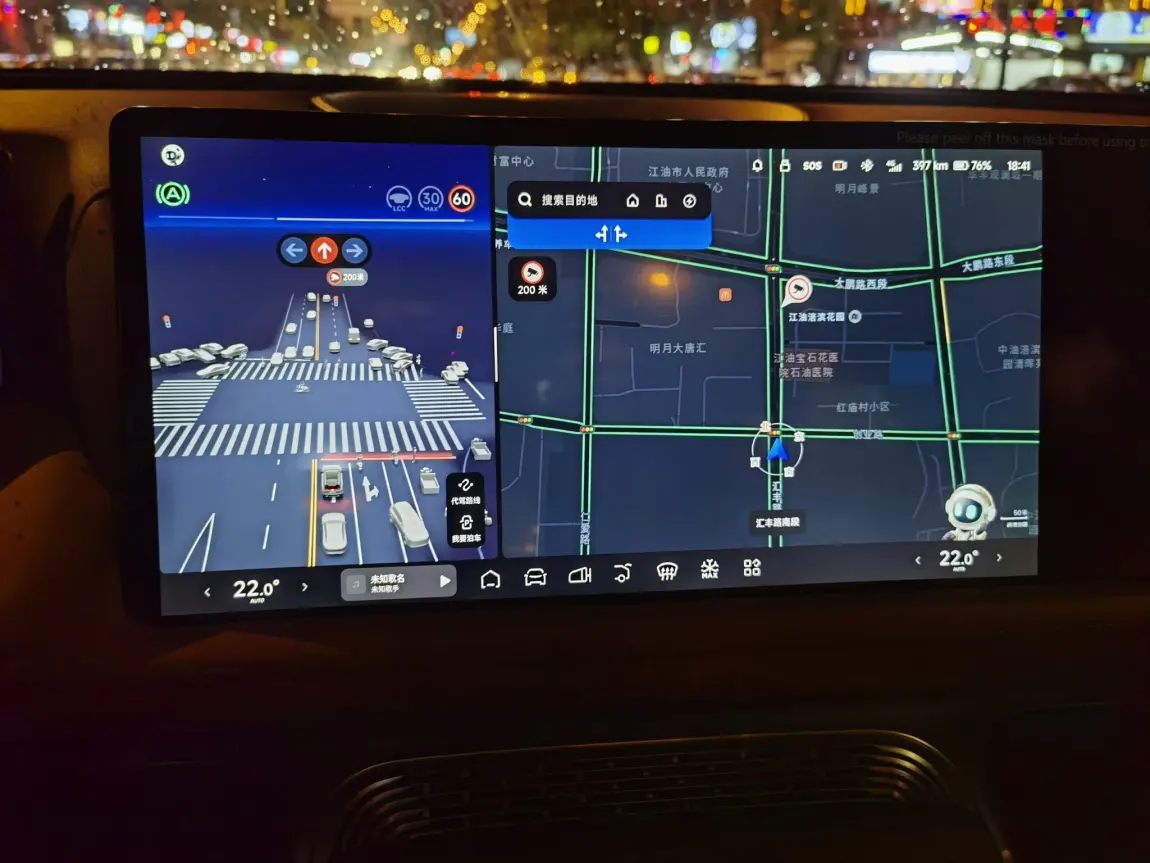 虽然万人尝鲜已过,进入全量推送了,但必竞第一次参与测试,还是履行测试义务,说明一下我就只跑了一趟200公里的还没开始收费的高速:1.过弯道好像没有5.3.5稳,2.偶尔没什么状况却减速,3.变道、减速貌似不够5.3.5柔和,4.这段没收费的高速是2023年底开通的但现在还只能LCC,5.导航地图好象有一点点老,6.三块屏幕不能自由没置内容比较遗憾,仪表屏中间只能选全域智驾或导航,但中控屏左分屏也只有全域智驾、导航或音乐三选一,而右分屏却只能被动全域智驾或导航,三块屏幕不能充分和自由利用。