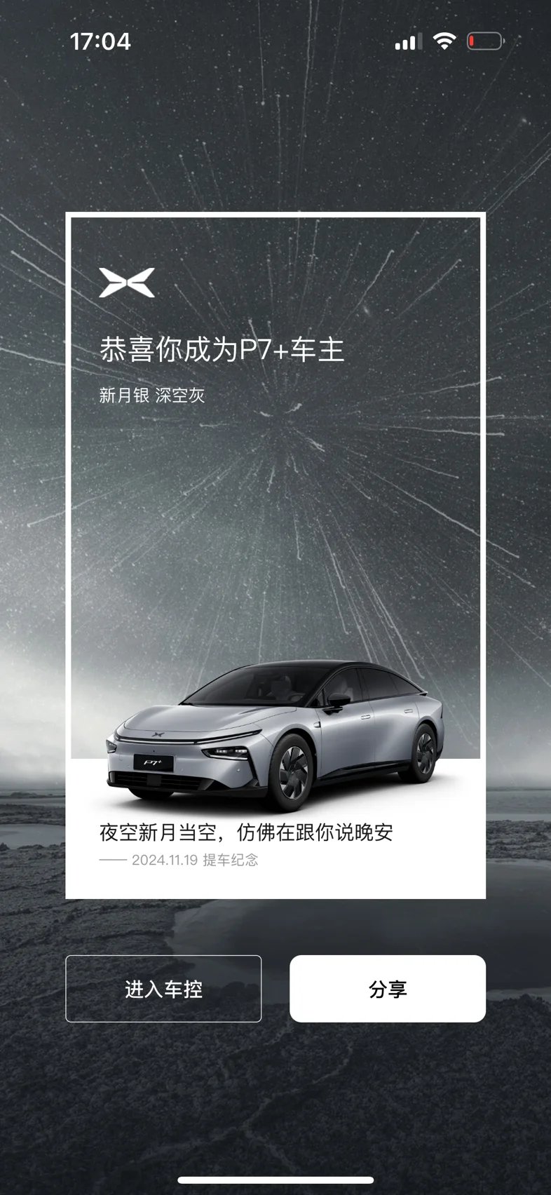 人生第一台车成功get! 从21年关注到小鹏p7,当时给我心动坏了,可惜当年大学毕业没多久,能力有限。今年9月看中Mona,试驾了以后马上下定了,9-13周,然后又延期,得年后交车,等得焦心。没多久p7+就开发布会了,和销售确认可以转单了以后就立马准备从Mona换到p7+了!第一次买车靠手速!11月7日当晚下定,14号配车,19号提车,一切都很顺利!感谢店里的销售人员和交付人员,因为当天发票一直在税务系统里查不到,交付人员下午还帮我去政务中心跑了一趟,虽然没在店里上牌,资料都给我准备得整整齐齐!我还粗心大意把发票落在车管所,还是小鹏的工作人员帮我第二天去取回来的!小p以后就和我一起游览祖国大好河山吧✊