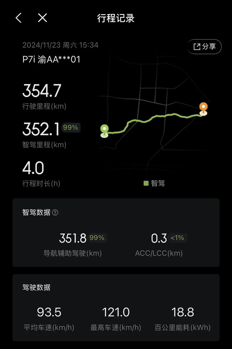 主要行程,全程几乎全部由车子自己开,大概走了50公里国道+城市道路,300公里高速。最高车速121,电耗18.8%