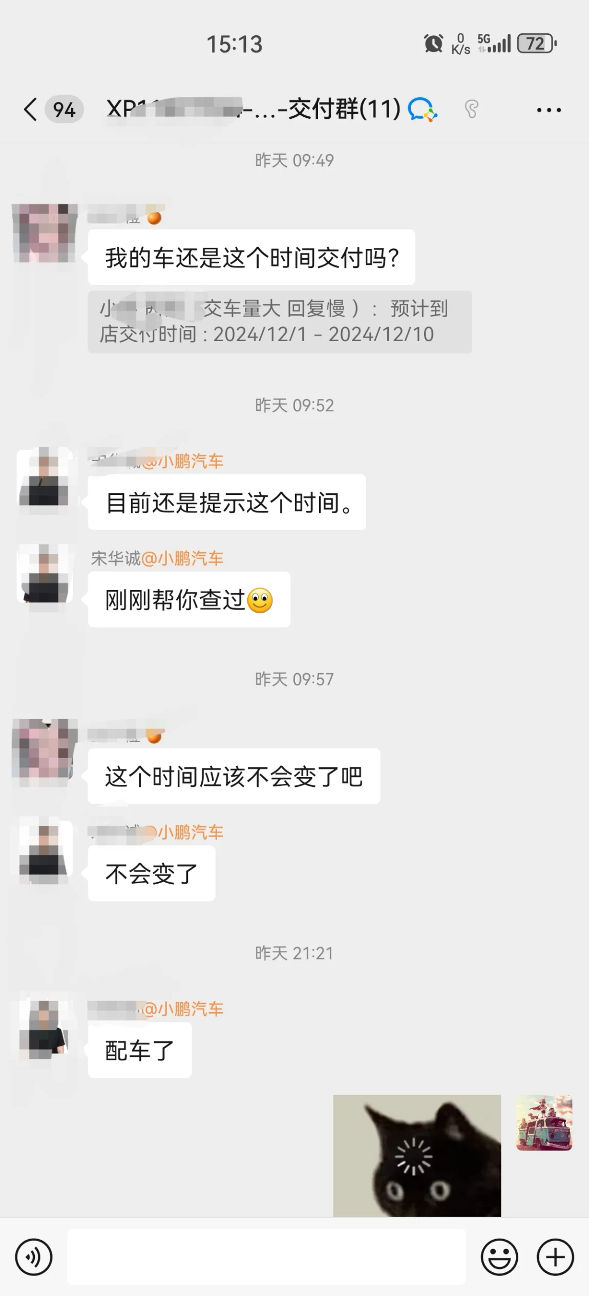 9.11锁单 m03星阙灰 长续航,一开始显示11月20日交付。10月12日被告知延期到12月1日到10日。期间多次交涉都说时间不变。11月26日再次交付群询问,销售表示不会在变化时间。 结果!当天晚上九点二十多,突然通知配车了。。。我还想多吃几天低保的(目前省补充足)