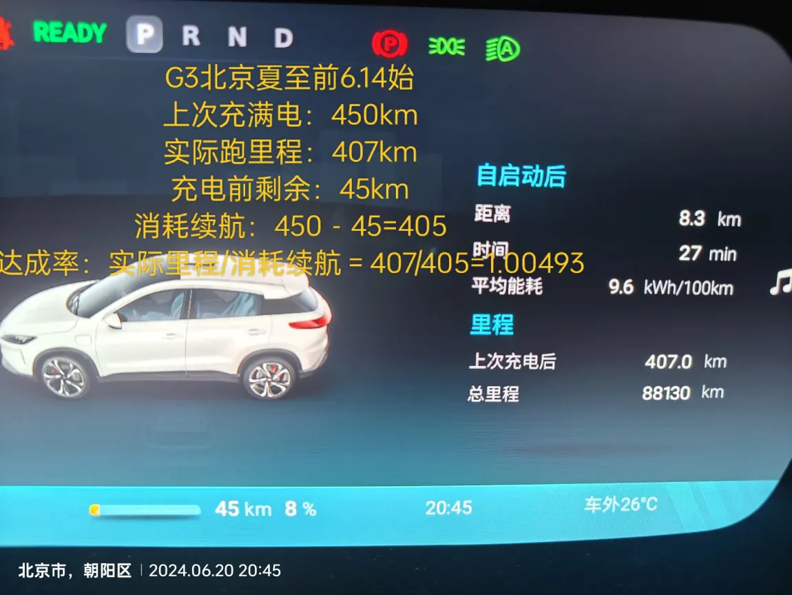 达成率:实际里程/消耗续航=407/405=1.00493——