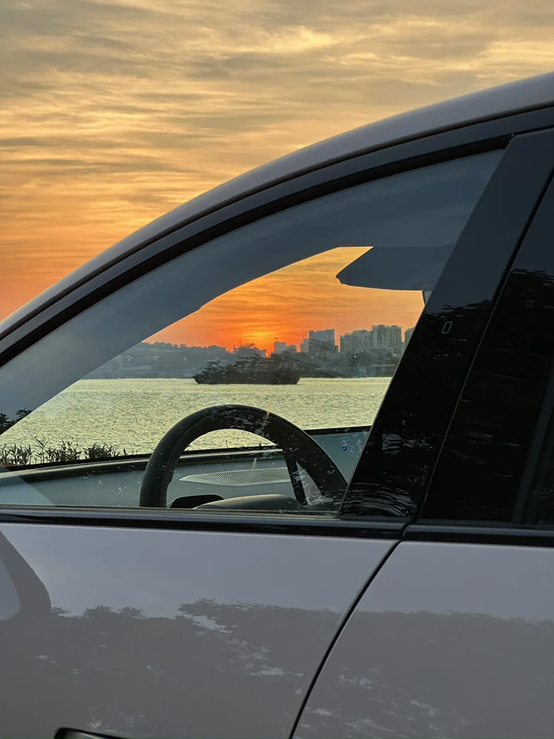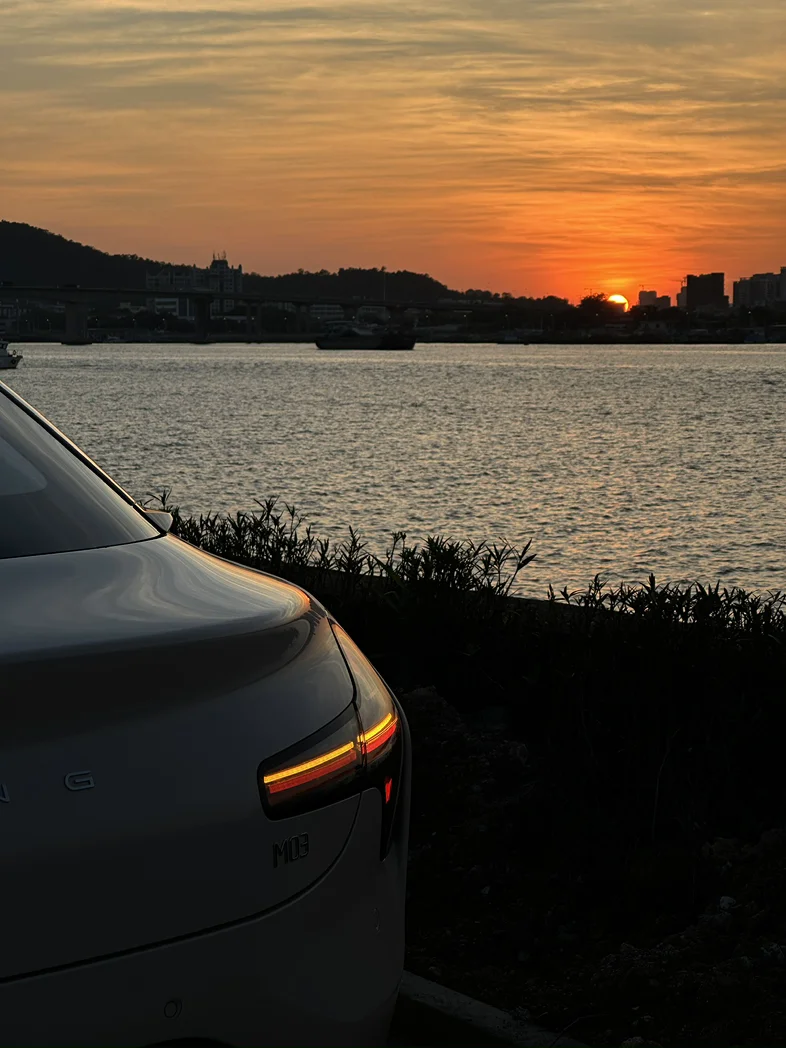 #我的提车作业# 提车办完手续就去了附近的海鸥岛玩,碰上了日落,拍下了属于它的第一张照片,等了这么久终于是开上m03了,已经做好延期最久的打算了,不过最后居然还提前交付了,到店也很快,提车还有一顿午餐,还帮忙洗了车,电量也在90%左右,功能讲解都挺到位的。