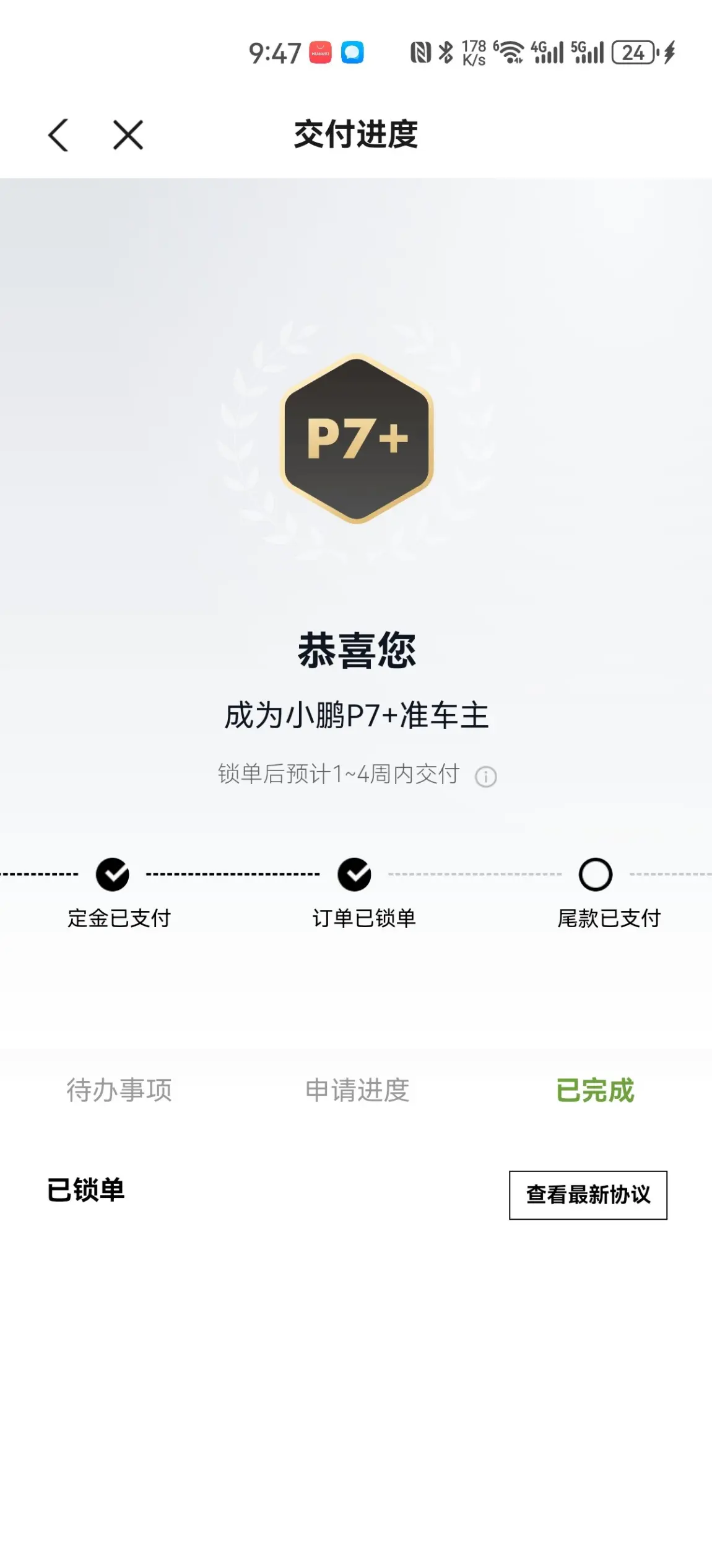 #我的提车作业# #小鹏P7加首批车主火热提车 #小鹏P7 小鹏P7加是我的第二辆车,也是我第一辆新能源电车,一开始我没有想过换电车,直到一次我朋友他要换电车,就带着我陆陆续续看了很多新能源电车,但都没有吸引我的地方,也没有让我能有换电车的想法,直到有一次我进了小鹏,看见了小鹏P7加,就深深的被他的外观还有空间吸引了,之后回去和老婆一商量,我也没想到老婆竟然同意了,然后就交了小订。但是还没下决心买,只是为了占3000的优惠,等到小鹏可以试驾之后,大定的决心,更强烈了,11.7号,21:26分,我订了我的第一套电车,小鹏P7加,最后感谢成都高新西区的销售和交付专员,服务很好,让我体验了一次愉快的提车经历