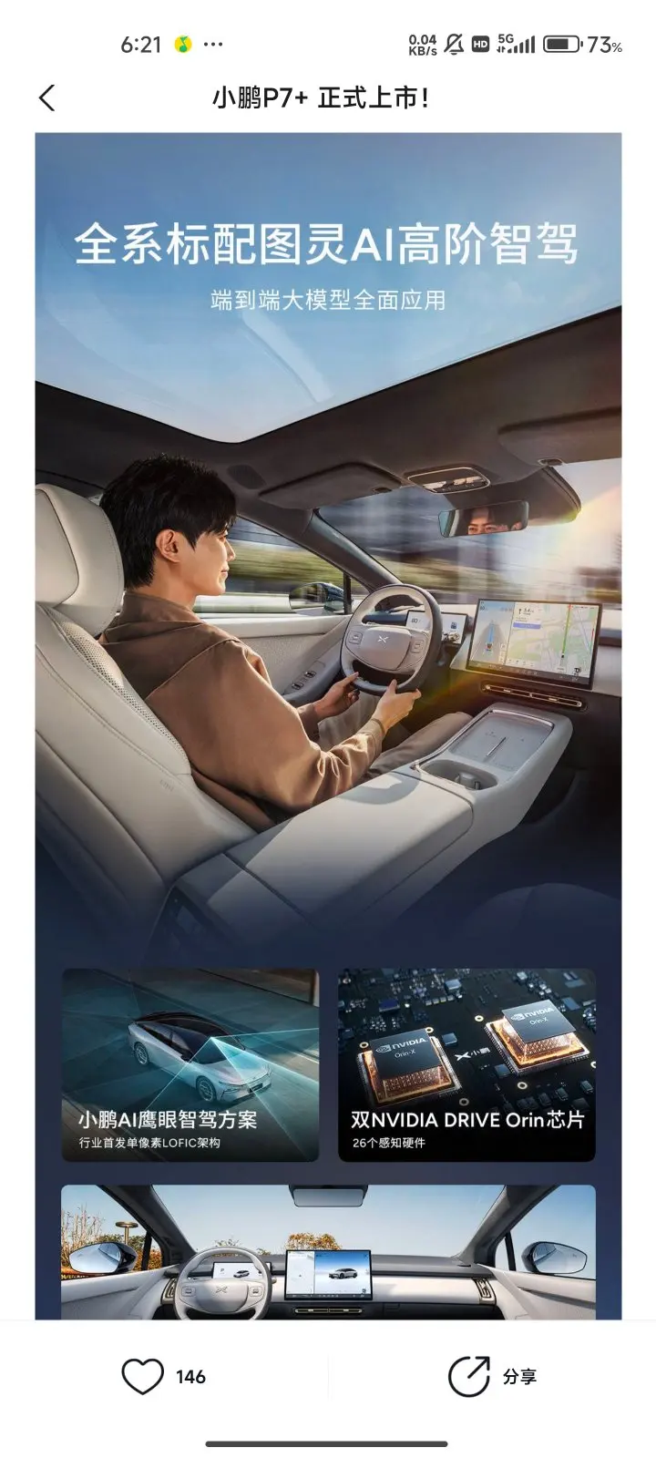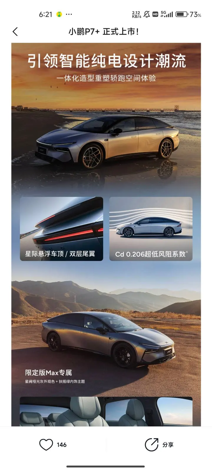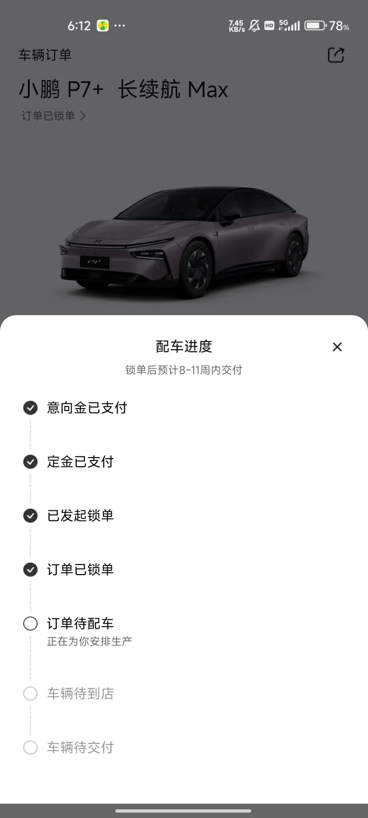 很高兴,选择小鹏P7+,看了很多车,最后选择了小鹏,第一续航,第二颜值,第三空间,第四智驾方便家人出行,装得多,操作方便就是还要等8-11周,好期待呀