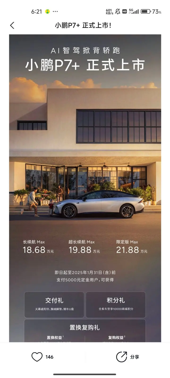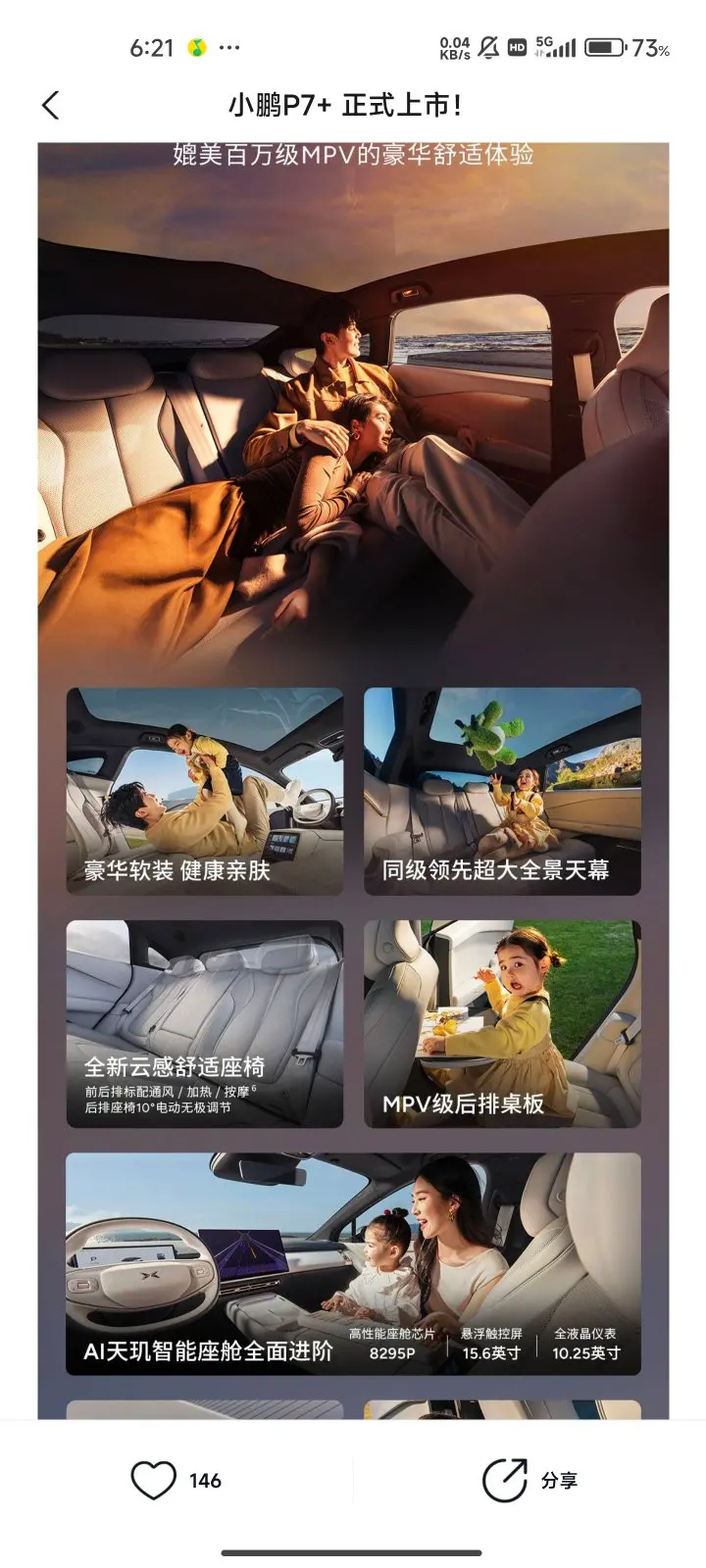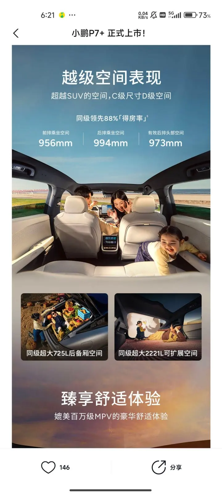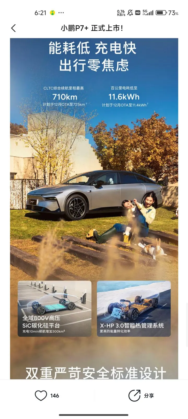 很高兴,选择小鹏P7+,看了很多车,最后选择了小鹏,第一续航,第二颜值,第三空间,第四智驾方便家人出行,装得多,操作方便就是还要等8-11周,好期待呀